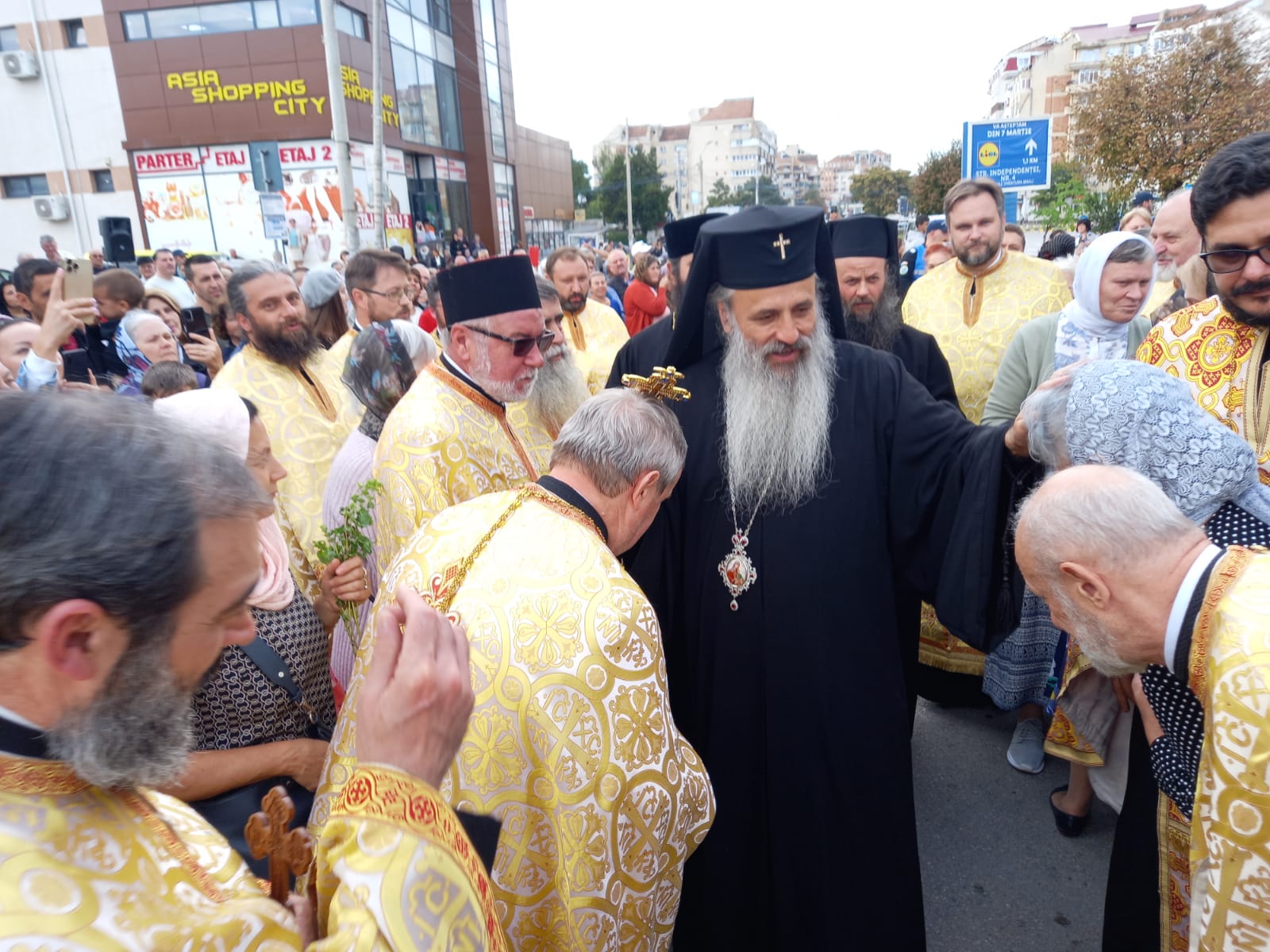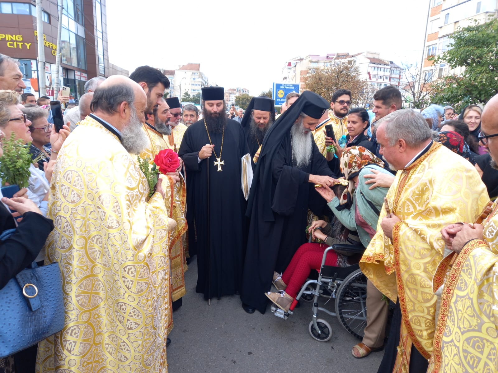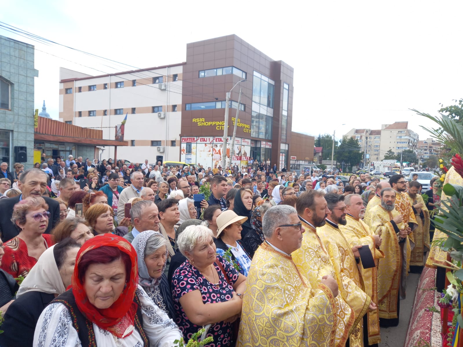 FOTO & VIDEO Slujbă cu sute de credincioși la monumentul Crucii de la Bazar. ÎPS Teofan întâmpinat de creștini cu flori de busuioc