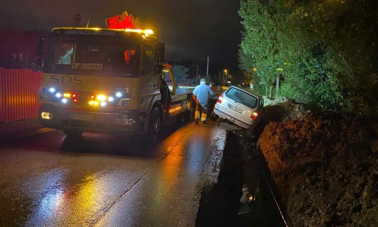 FOTO Mașină căzută într-un șanț săpat pe marginea drumului. Șoferul era în mașină cu copiii