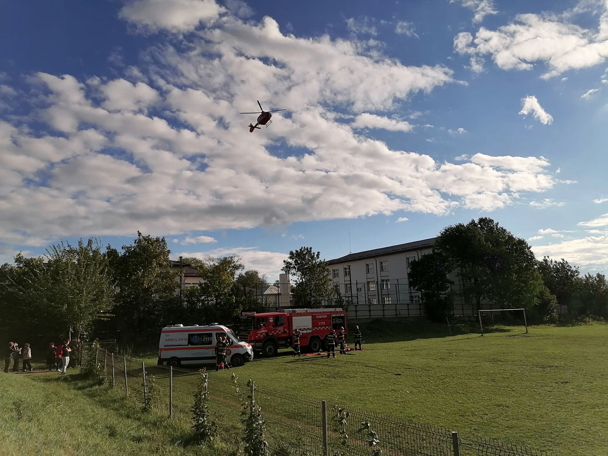 Pompierii dorohoieni asigură măsurile pentru aterizarea și decolarea elicopterului SMURD.