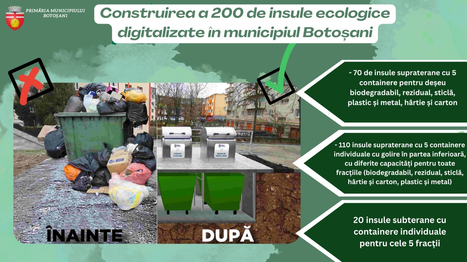 Primăria vrea să amenajeze 200 de insule ecologice în municipiul Botoșani, printr-un proiect privind „Construirea de insule ecologice digitalizate în Municipiul Botoșani, Județul Botoșani”, prin Programul Național de Redresare și Reziliență (PNRR) – Componenta C3 (Managementul Deșeurilor).