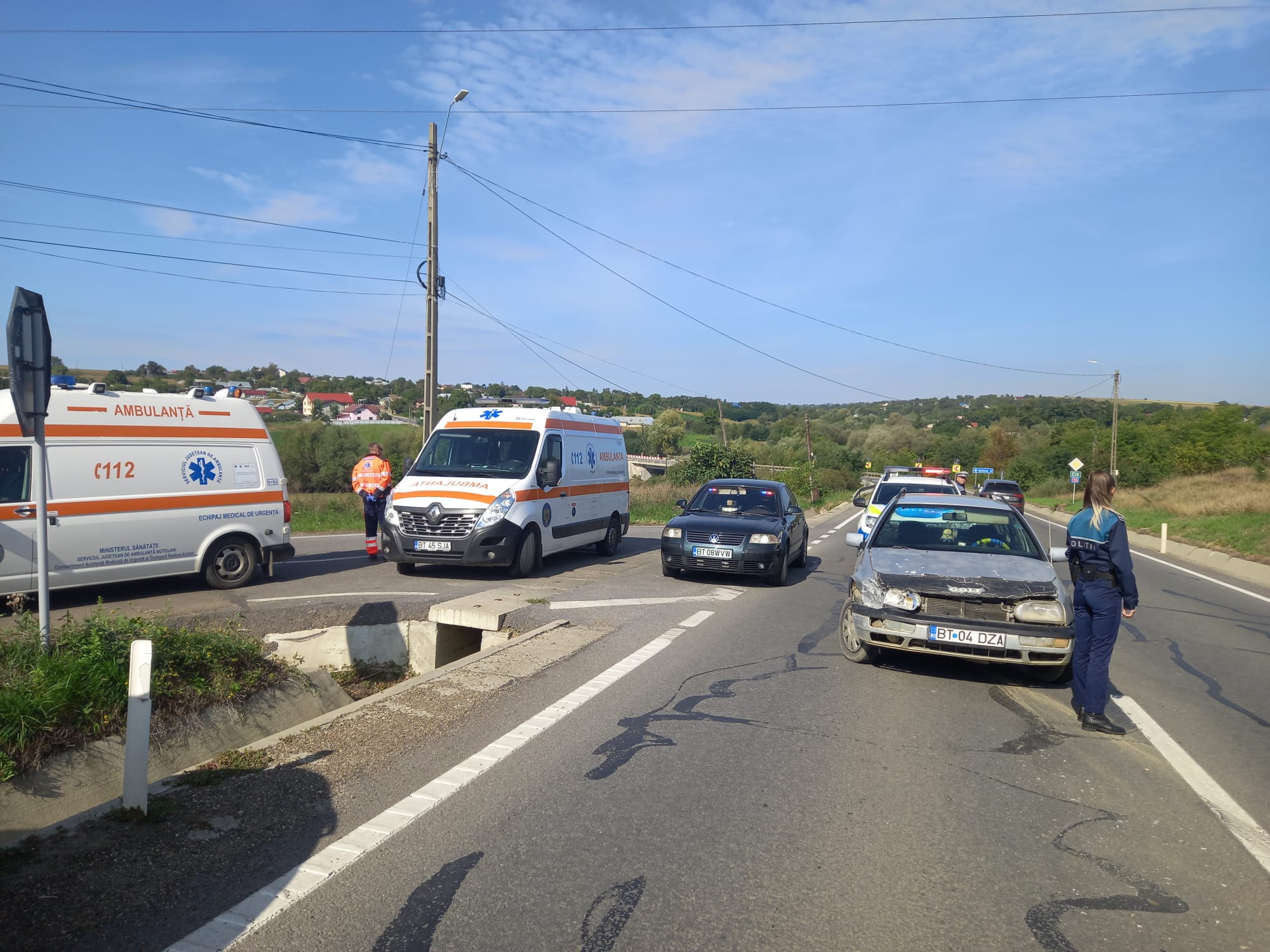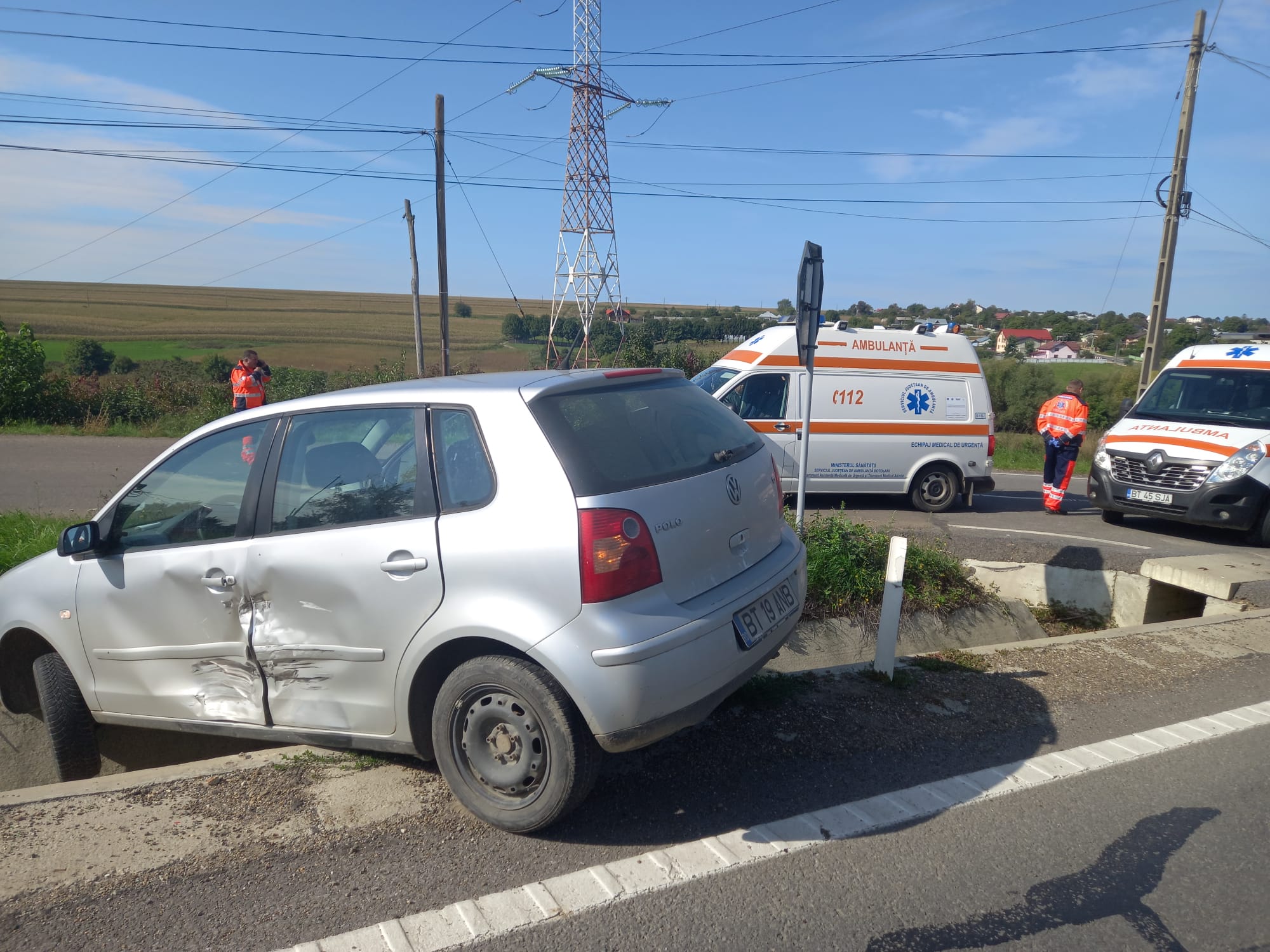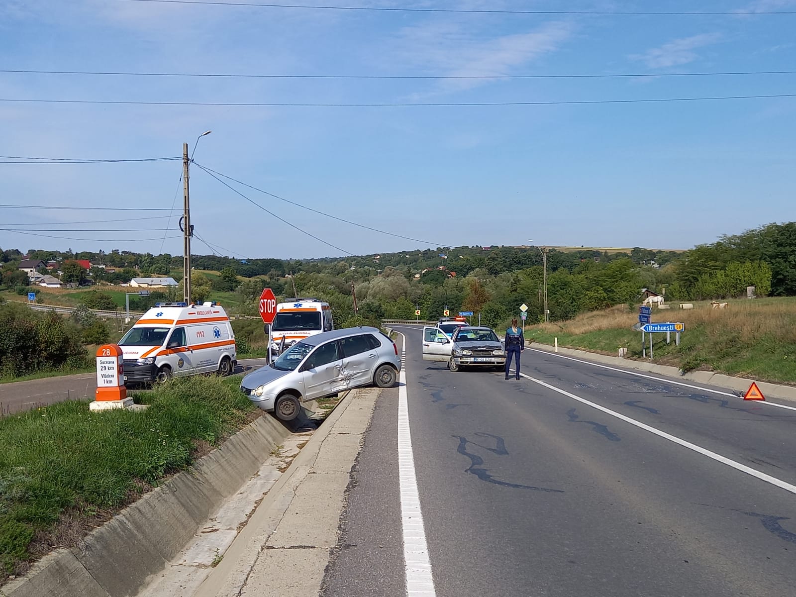 Cele două mașini s-au ciocnit, apoi autoturismul Polo a rămas suspendat peste rigola betonată de pe partea dreaptă a drumului.