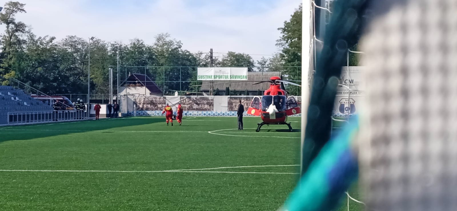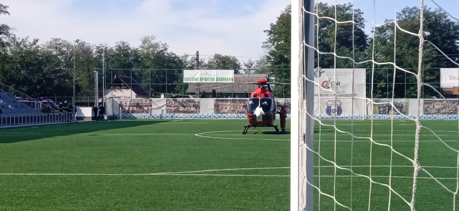 În vârstă de 55 de ani, bărbatul a suferit un infarct, iar medicii botoșăneni au decis transferul la o clinică de specialitate din Iași. Elicopterul a aterizat pe stadionul din Săveni, de unde a preluat pacientul.
