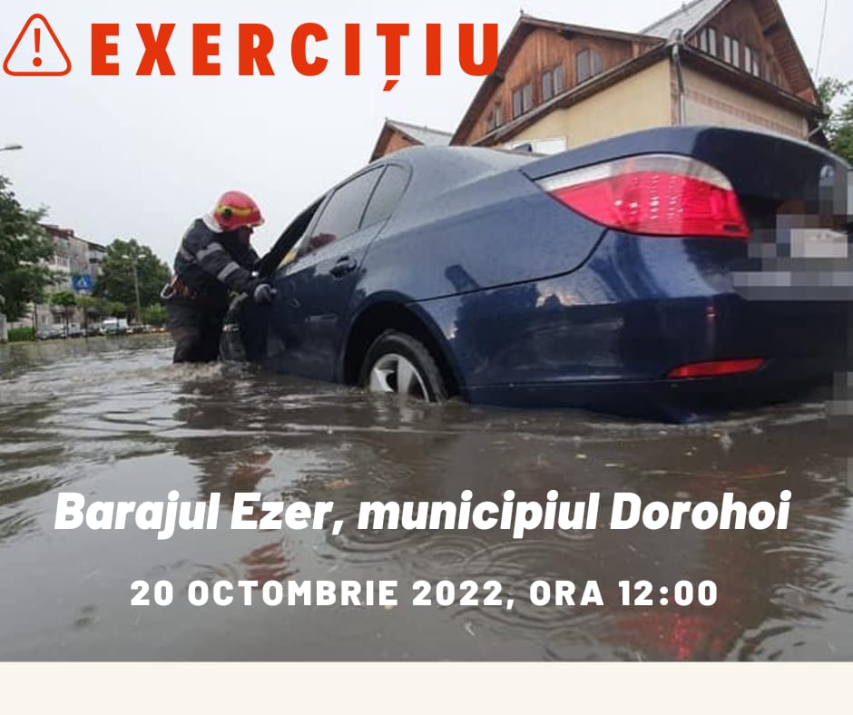 Inspectoratul pentru Situații de Urgență „Nicolae Iorga” al Județului Botoșani va organiza, joi, un exercițiu cu forțe și mijloace în teren. Acesta se va desfășura în zona acumulării Ezer, începând cu ora 12.00. Conform scenariului o parte din municipiul Dorohoi a fost inundat ca urmare a producerii unor avarii la acumularea Ezer.