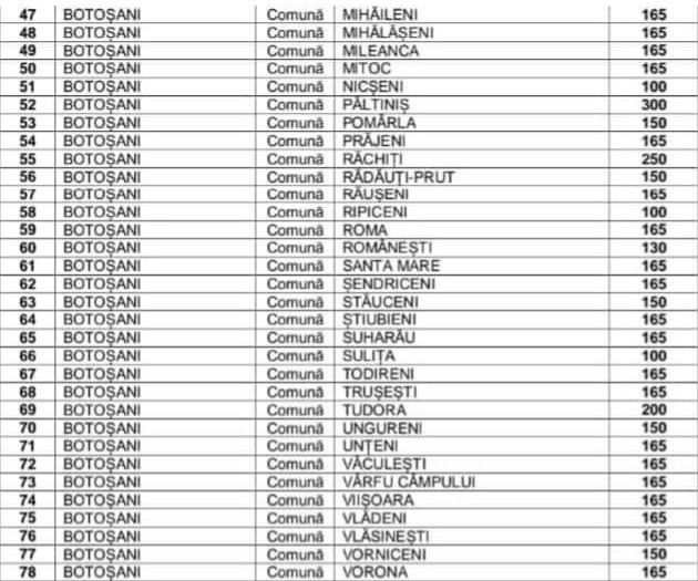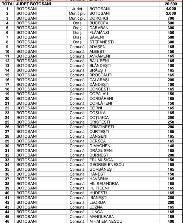 Suma alocată pentru primării este net inferioară celei solicitate. Cea mai mare sumă a sot alocată Consiliului Județean, care a primit patru milioane de lei, urmat de Primăria municipiului Botoșani, cu 2 milioane de lei. Municipiul Dorohoi a primi 700.000 de lei, iar orașele între 300.000 și 500.000 de lei. Spre exemplu, orașele Bucecea și Săveni au primit 500.000 de lei, orașul Flămânzi 450.000 de lei, iar orașele Darabani și Ștefănești câte 300.000 de lei.