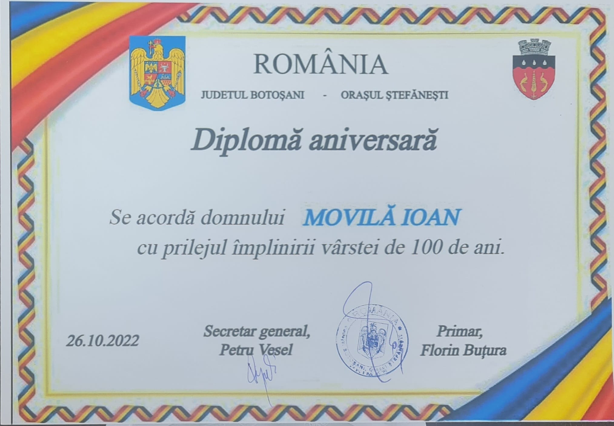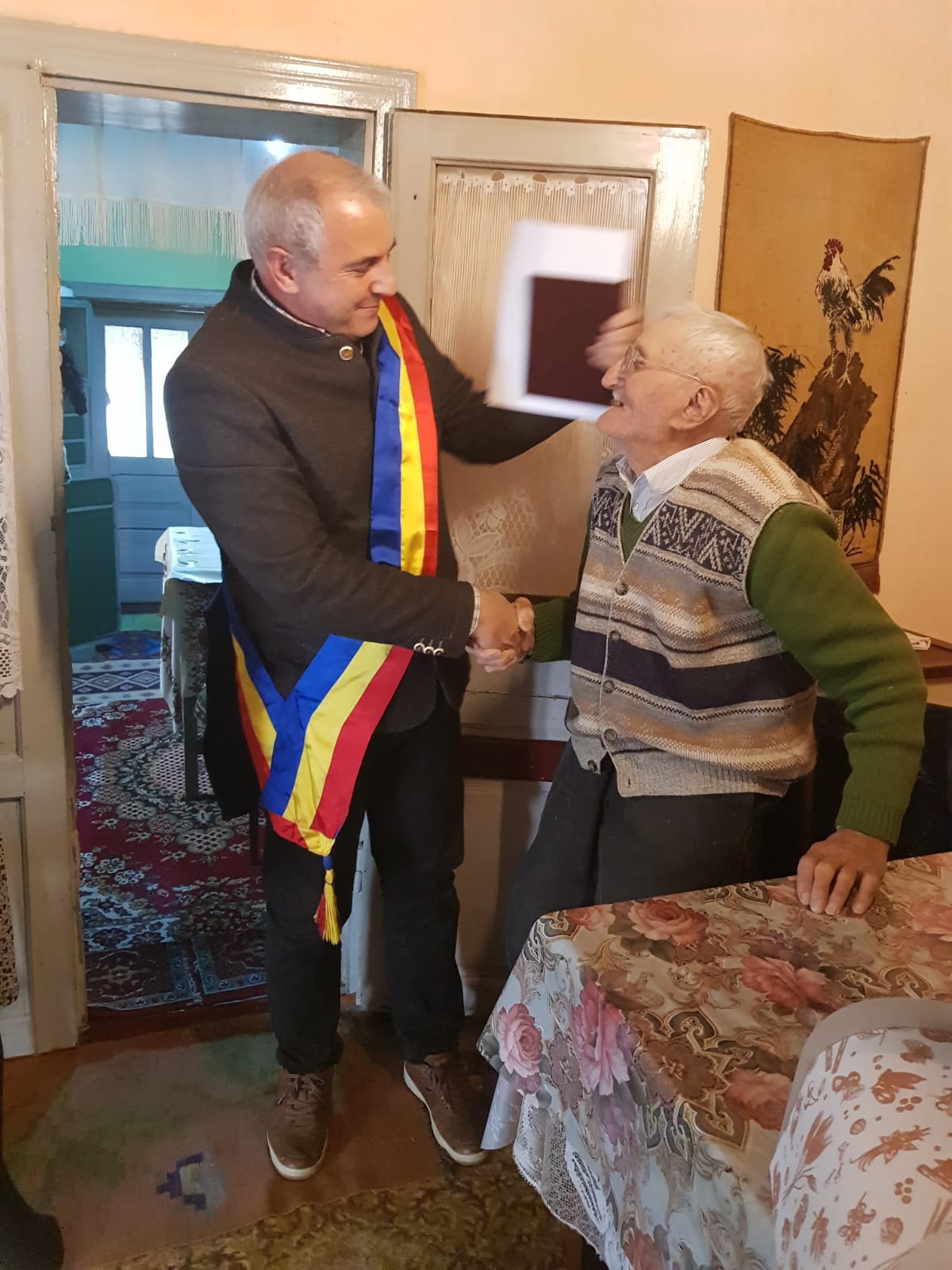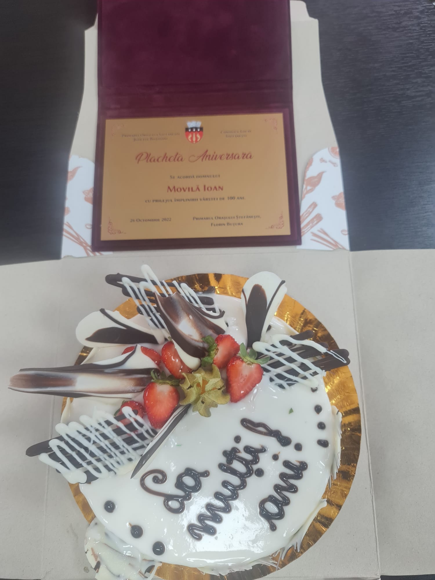În jurul amiezii a mai avut o surpriză. Primarul din Ștefănești, Florin Buțura, a mers să îl felicite și i-a oferit un tort, o diplomă aniversară, dar și o sumă de 500 lei din partea Primăriei. Este cel mai vârstnic cetățean din Ștefănești și pentru cei care îl cunosc reprezintă o adevărată oază de amintiri.