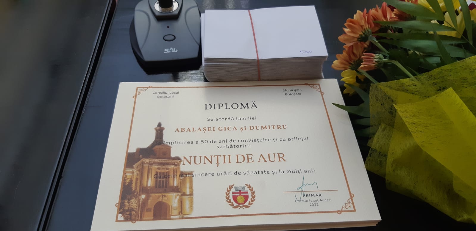Primarul municipiului Botoșani, Cosmin Andrei, le-a înmânat cuplurilor câte un buchet de flori, o diplomă și un plic cu bani. Gestul municipalității a adus zâmbete pe chipurile vârstnicilor. Un moment amuzant când edilul a înmânat buchetul de flori unei doamne, iar când să îi ofere și plicul cu bani, aceasta a spus că banii trebuie dați soțului.