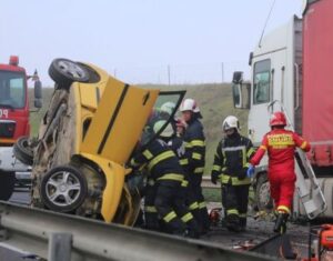 Imagini de coşmar, după un accident grav de circulație produs duminică, la intrarea pe A3. Un autoturism în care se afla o familie s-a răsturnat, după ce s-a lovit de un TIR. Mama a murit, iar tatăl este în stare gravă, anunță echipele de intervenție.