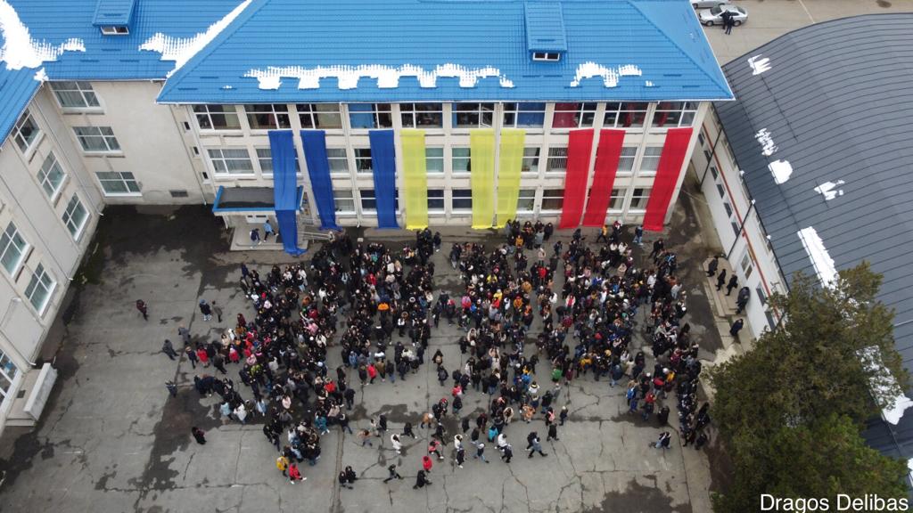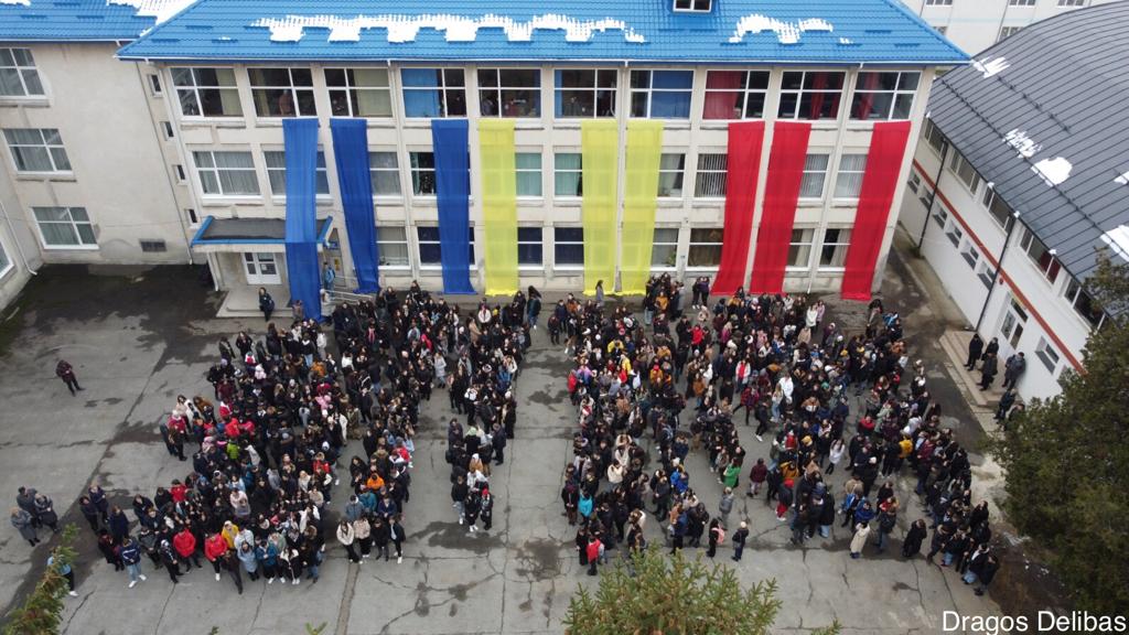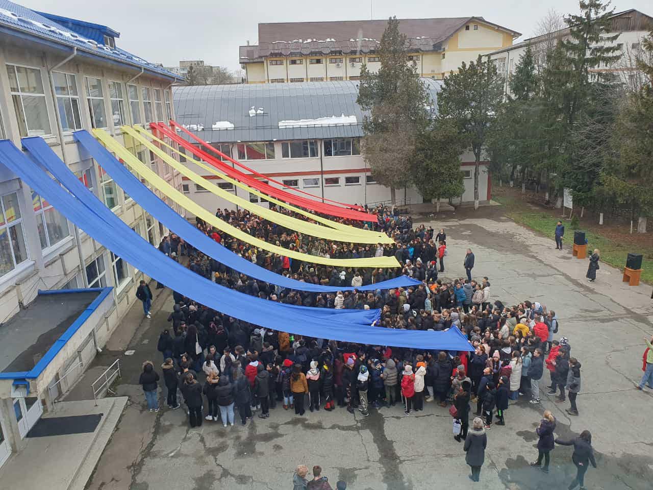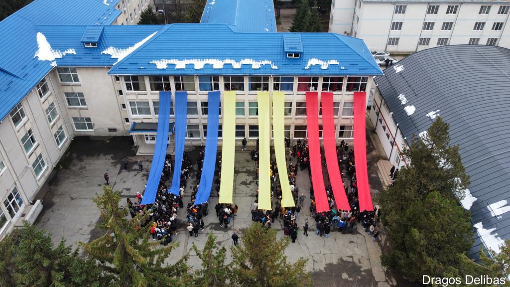Sute de elevi și profesori ai Colegiului Național „Mihai Eminescu” din Botoșani au participat, marți, la un eveniment inedit dedicat Zilei Naționale a României. Mai multe panglici tricolore uriașe au fost desfășurate pe lățimea terenului de festivități, acoperind participanții la eveniment. Acestea au fost ridicate apoi cu ajutorul unor sfori până la etajul 2 al clădirii liceului, formând steagul României.În tot acest timp, cei prezenți au ascultat Imnul României.