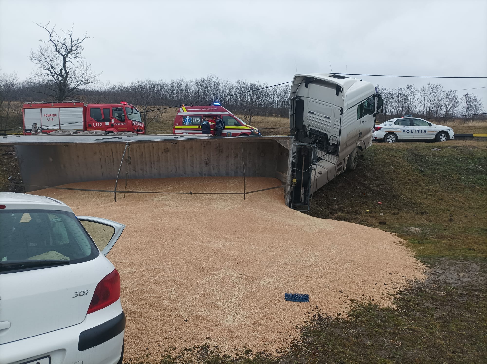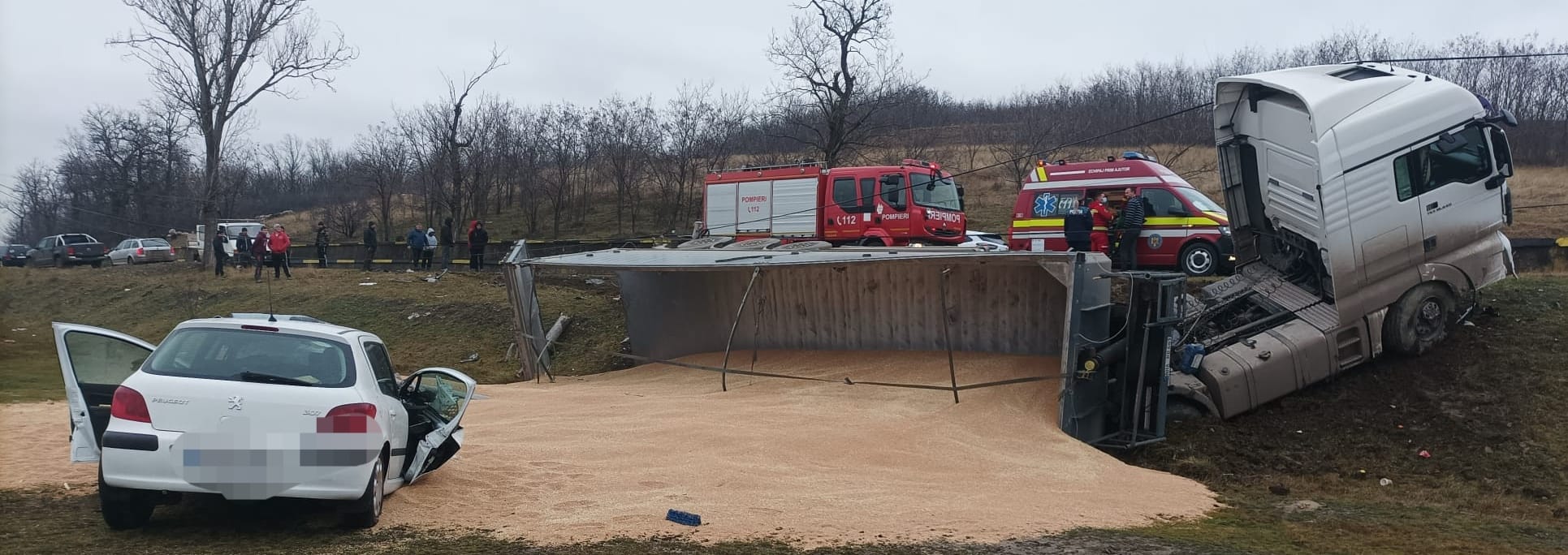 Un bărbat a fost rănit, sâmbătă, după coliziunea dintre un autoturism și un camion care a avut loc pe un drum național din Botoșani. Potrivit pompierilor, un bărbat, în vârstă de 84 de ani, a fost rănit după ce autoturismul pe care îl conducea, un Peugeot, a intrat în coliziune cu camionul încărcat cu cereale, care ulterior s-a răsturnat în afara părții carosabile. Evenimentul s-a produs pe raza localității Santa Mare.