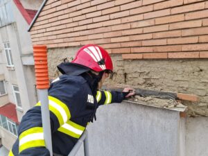 Pompierii botoșăneni au intervenit, miercuri, după ce bucăți de cărămidă riscau să cadă de pe un bloc peste trecători.