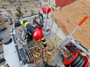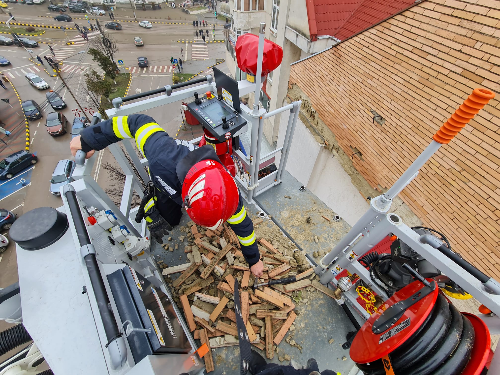 Aceștia au intervenit rapid și au înlăturat bucațile de tencuială decorativă de pe o suprafață de aproximativ doi metri pătrați, cu ajutorul autospecialei pentru intervenție și salvare de la înălțime.
