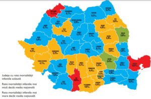 România are cea mai mare rată a mortalității infantile din UE, 5,6 la mia de copii născuți vii, față de 3,3, media europeană, potrivit celor mai recente date centralizate la nivelul Uniunii Europene pentru anul 2020; mai mult însă, sunt județe unde rata mortalității infantile este și de peste trei ori mai mare decât media din UE: astfel, mortalitatea infantilă a ajuns la 11,1 la mia de copii născuți vii, în județul Satu Mare, și la 10 la mie, în județul Tulcea, arată datele INS pentru anul 2020. La Botoșani, rata mortalității infantile este de 6,2 la mie. Organizația Salvați Copiii România atrage atenția asupra disparităților mari dintre județele țării și face un apel pentru dotarea urgentă a maternităților și secțiilor de terapie intensivă neonatală, prin redirecționarea a 20% din impozitul pe profit.