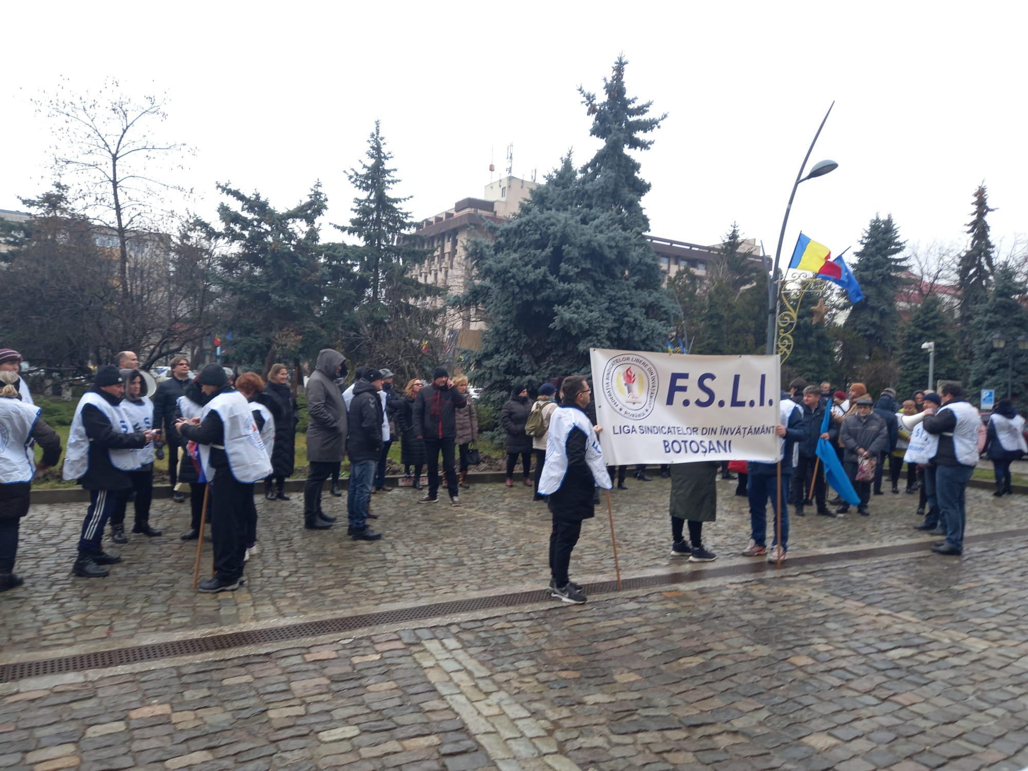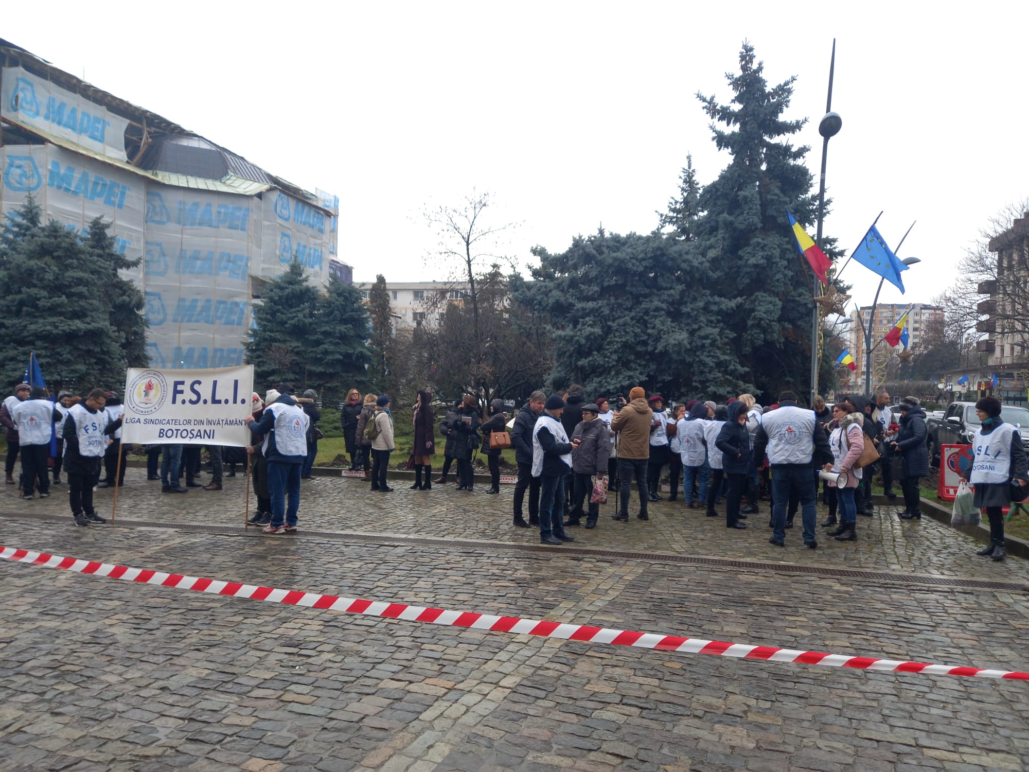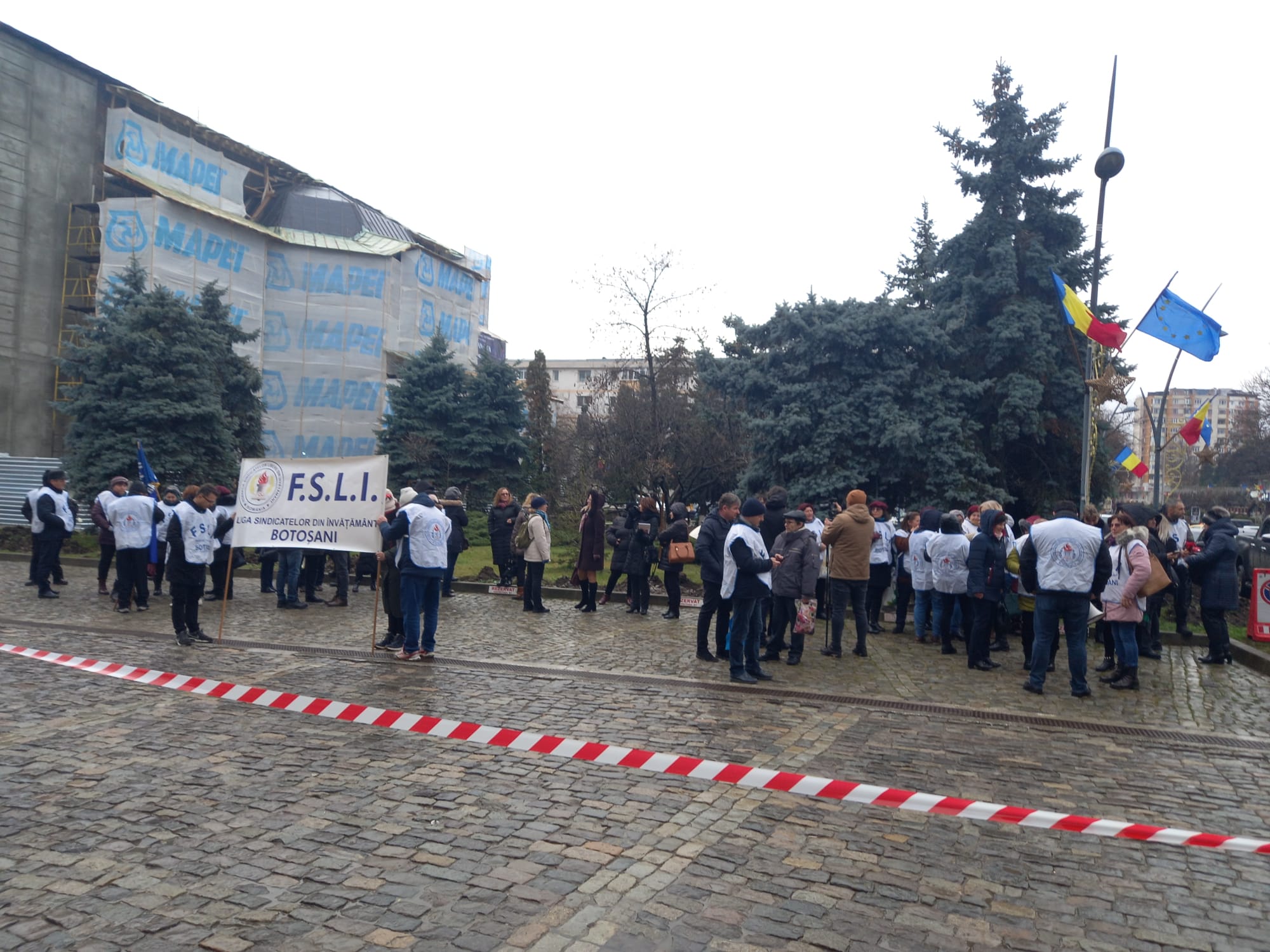 Zeci de angajați din învățământul botoșănean au ieșit în stradă, vineri, pentru a protesta. Oamenii s-au adunat în fața Instituției Prefectului. Este vorba de aproximativ 70 de angajați, personal nedidactic, care și-au strigat nemulțumirile.
