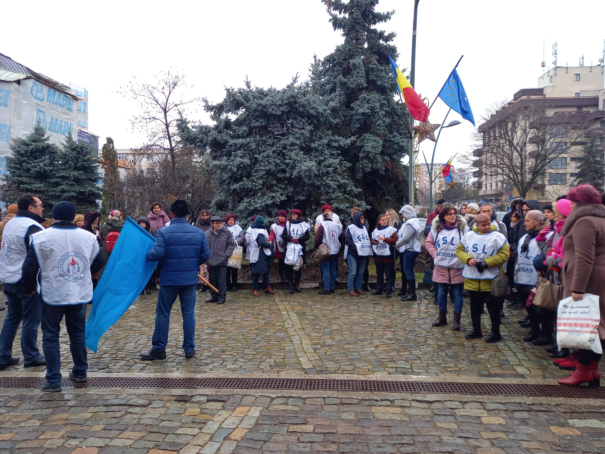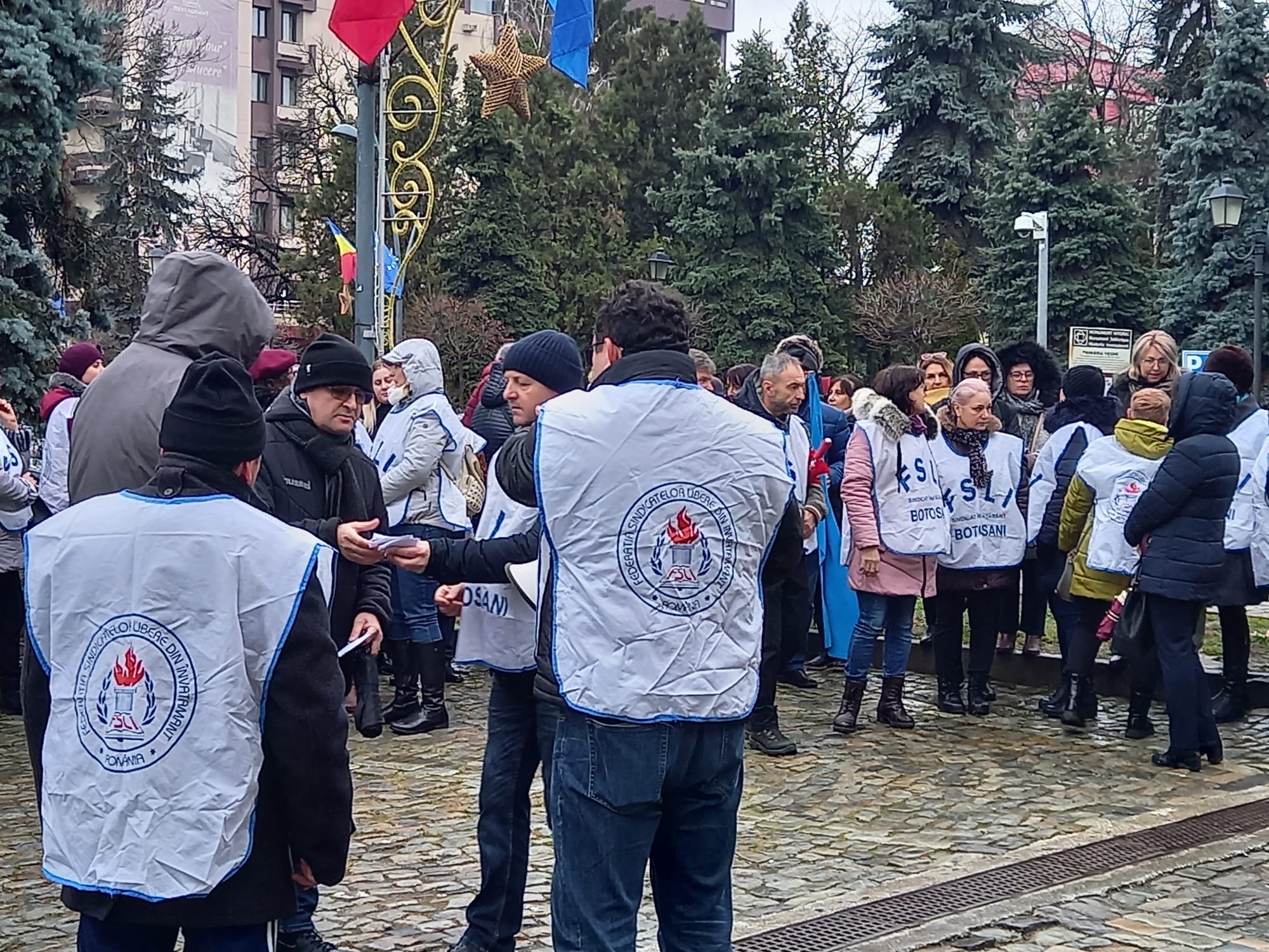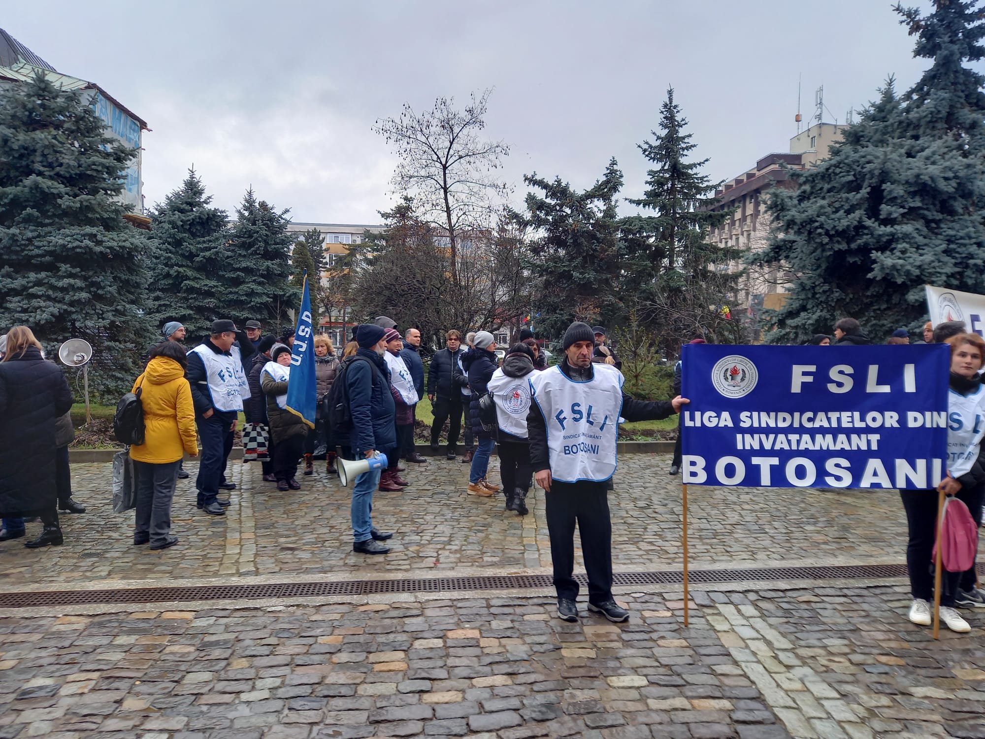 Zeci de angajați din învățământul botoșănean au ieșit în stradă, vineri, pentru a protesta. Oamenii s-au adunat în fața Instituției Prefectului. Este vorba de aproximativ 70 de angajați, personal nedidactic, care și-au strigat nemulțumirile.