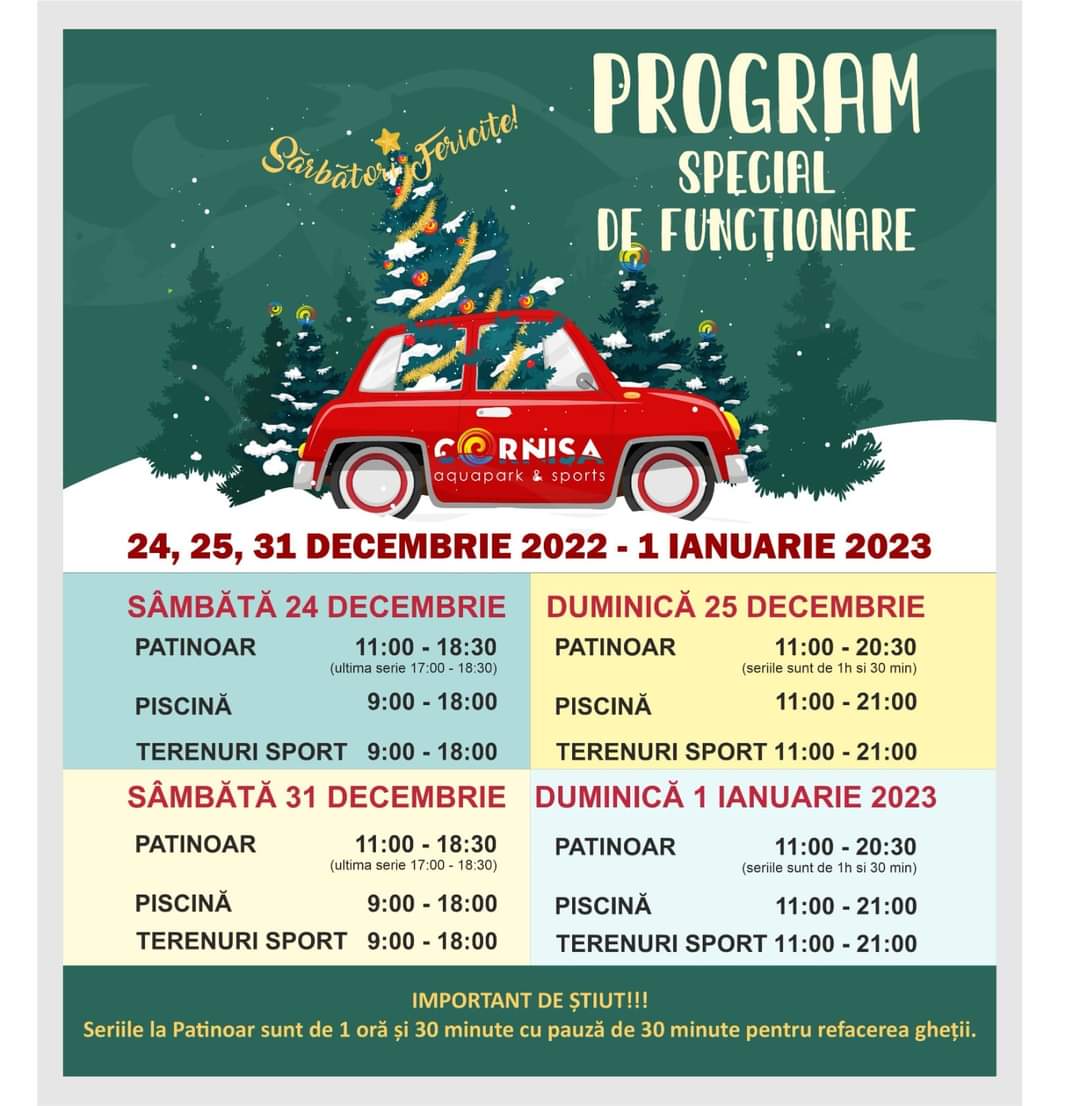 La patinoar, în zilele de sâmbătă 24, respectiv 31 decembrie, programul este de la ora 11.00 la 18.30, la piscină -9.00-18.00, același program fiind și la terenurile de sport.
