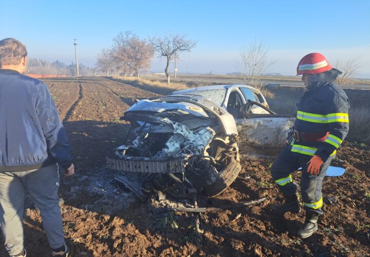 FOTO Accident la Botoșani! O mașină a lovit un copac, s-a răsturnat, apoi a luat foc