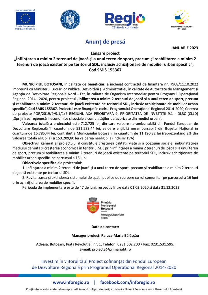 MUNICIPIUL BOTOȘANI, în calitate de beneficiar, a încheiat contractul de finanțare nr. 7968/11.10.2022 împreună cu Ministerul Lucrărilor Publice, Dezvoltării și Administrației, în calitate de Autoritate de Management și Agenția de Dezvoltare Regională Nord – Est, în calitate de Organism Intermediar pentru Programul Operațional Regional 2014 – 2020, pentru proiectul „Înființarea a minim 2 terenuri de joacă și a unui teren de sport, precum și reabilitarea a minim 2 terenuri de joacă existente pe teritoriul SDL, inclusiv achiziționare de mobilier urban specific“, Cod SMIS 155367. Proiectul este finanțat în cadrul Programului Operațional Regional 2014-2020, Cererea de proiecte POR/2019/9/9.1/1/7 REGIUNI, AXA PRIORITARĂ 9, PRIORITATEA DE INVESTIȚII 9.1 – DLRC (CLLD) „Sprijinirea regenerării economice și sociale a comunităților defavorizate din mediul urban“.