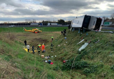 FOTO Autocar din Botoșani, răsturnat în Italia. Doi pasageri transportați cu elicopterul la spital
