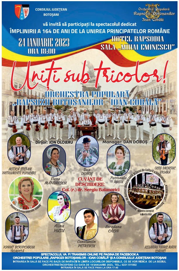 Orchestra Populară Rapsozii Botoșanilor „Ioan Cobâlă” împreună cu Consiliul Județean Botoșani  vă invită la sărbătoarea dedicată Zilei Micii Uniri – Împlinirea a 164 de ani de la Unirea Principatelor Române. Spectacolul intitulat „Uniți sub tricolor!” va avea loc pe data de 24 ianuarie 2023, începând cu orele1800, la Hotel Rapsodia – Sala Mihai Eminescu din municipiul Botoșani.