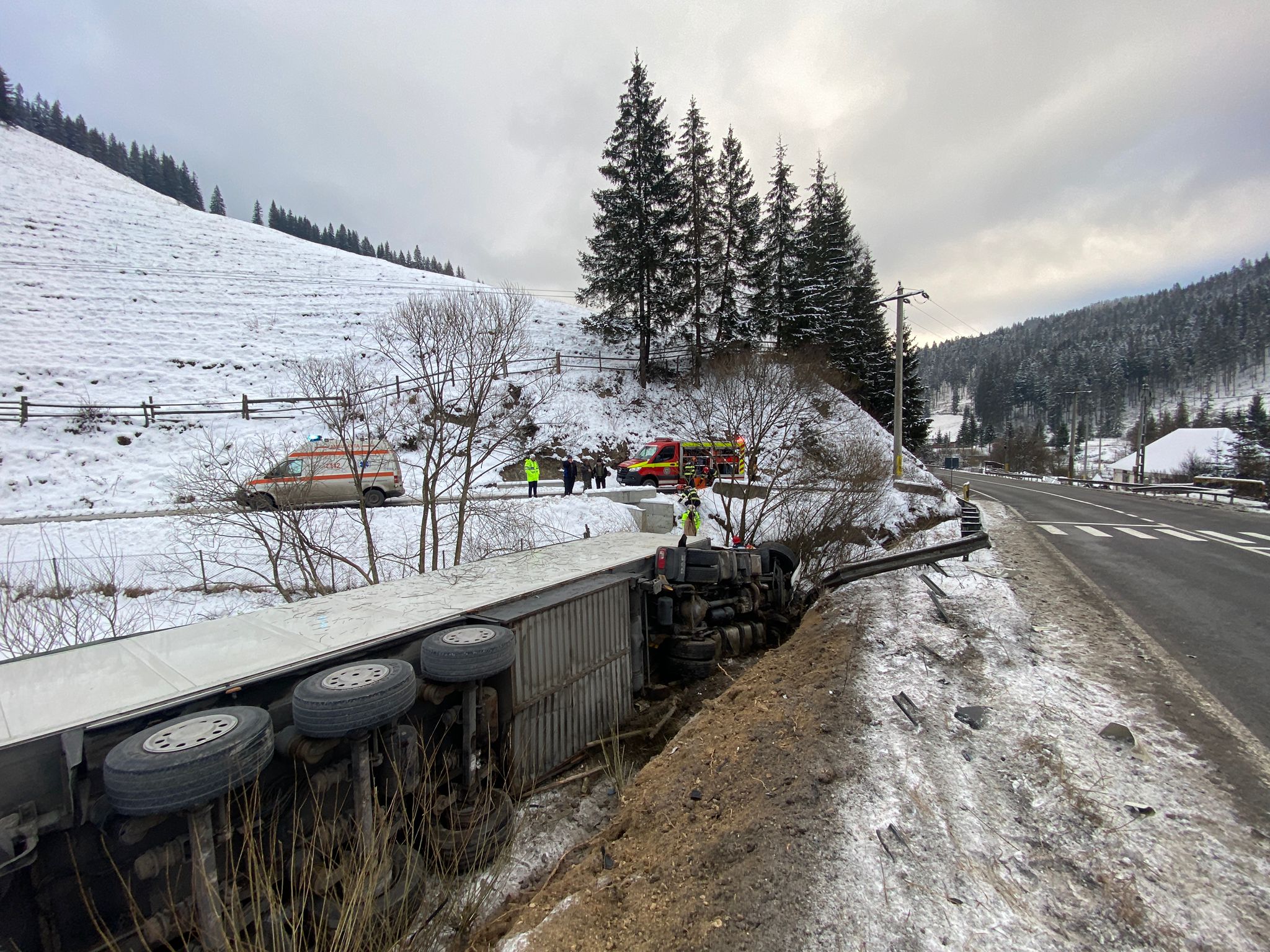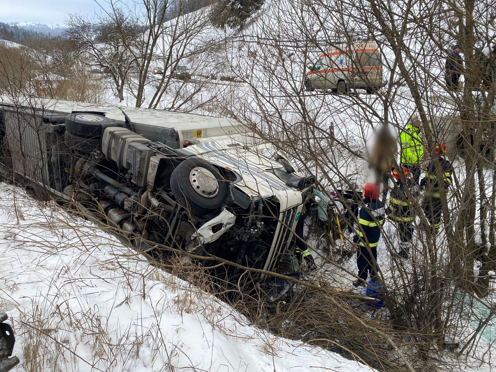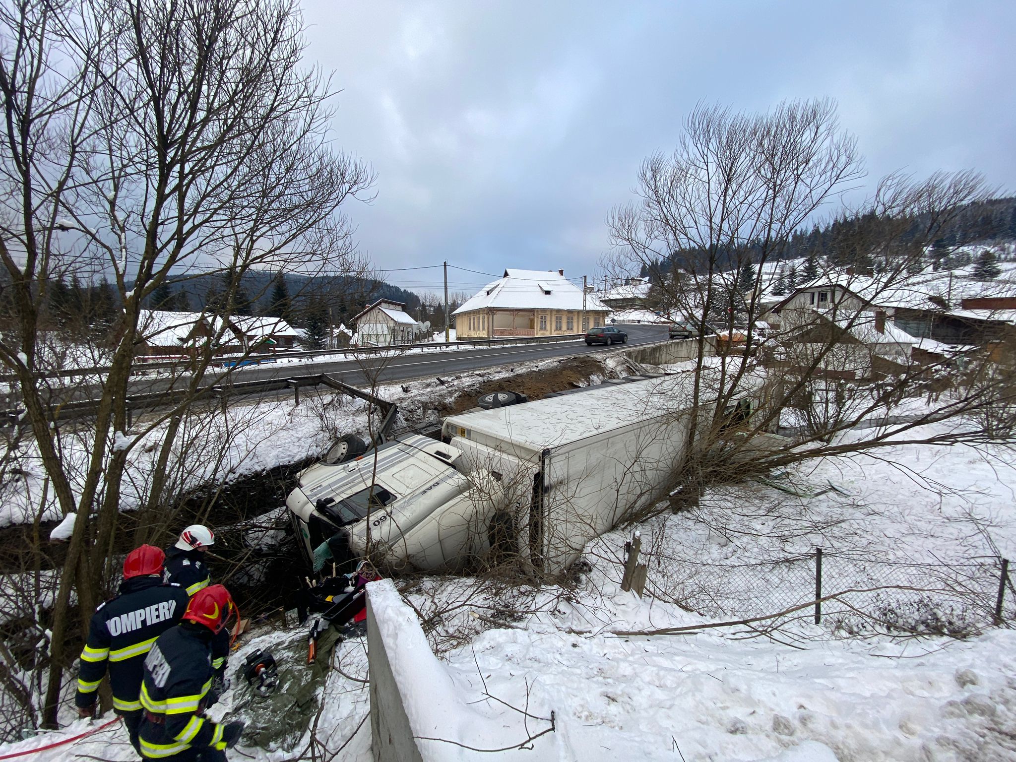 Autotrenul s-a rasturnat pe o parte, in albia unui parau, iar apa s-a adunat in cabina si exista pericolul ca soferul, prins in interior, sa intre in soc hipotermic.