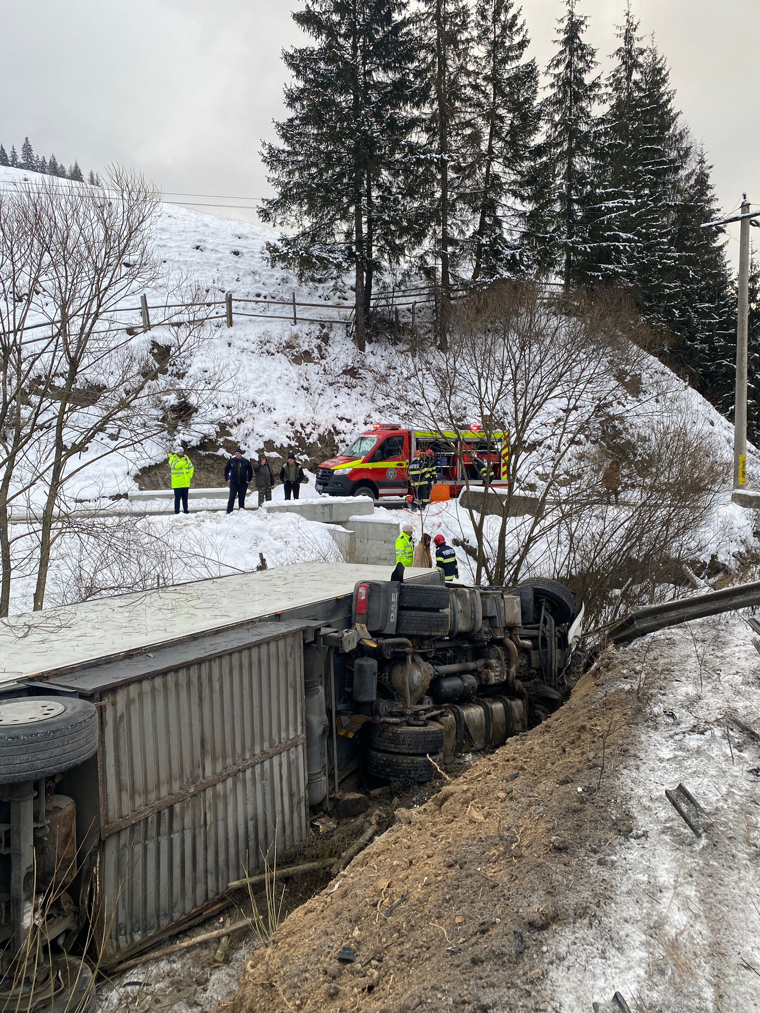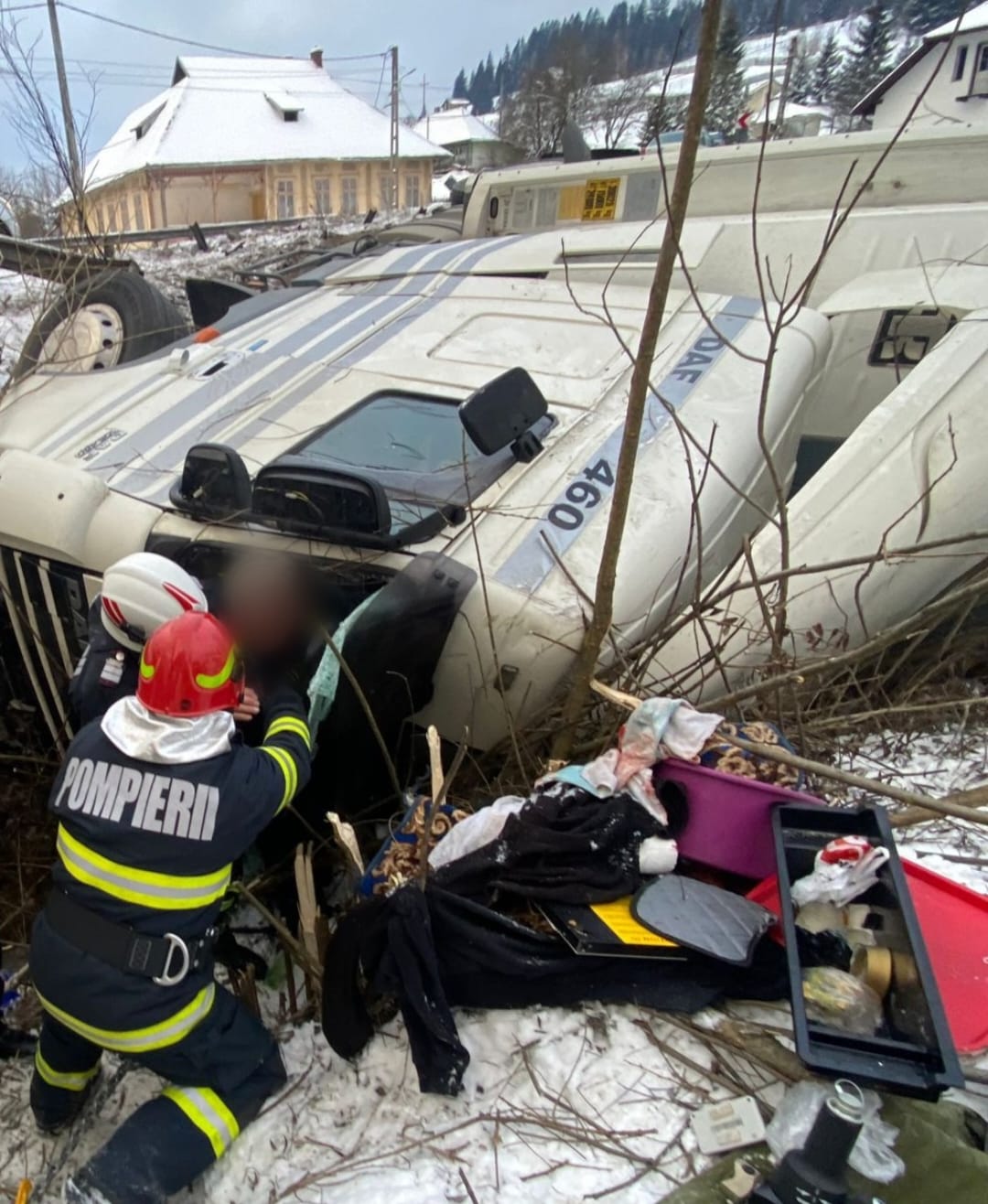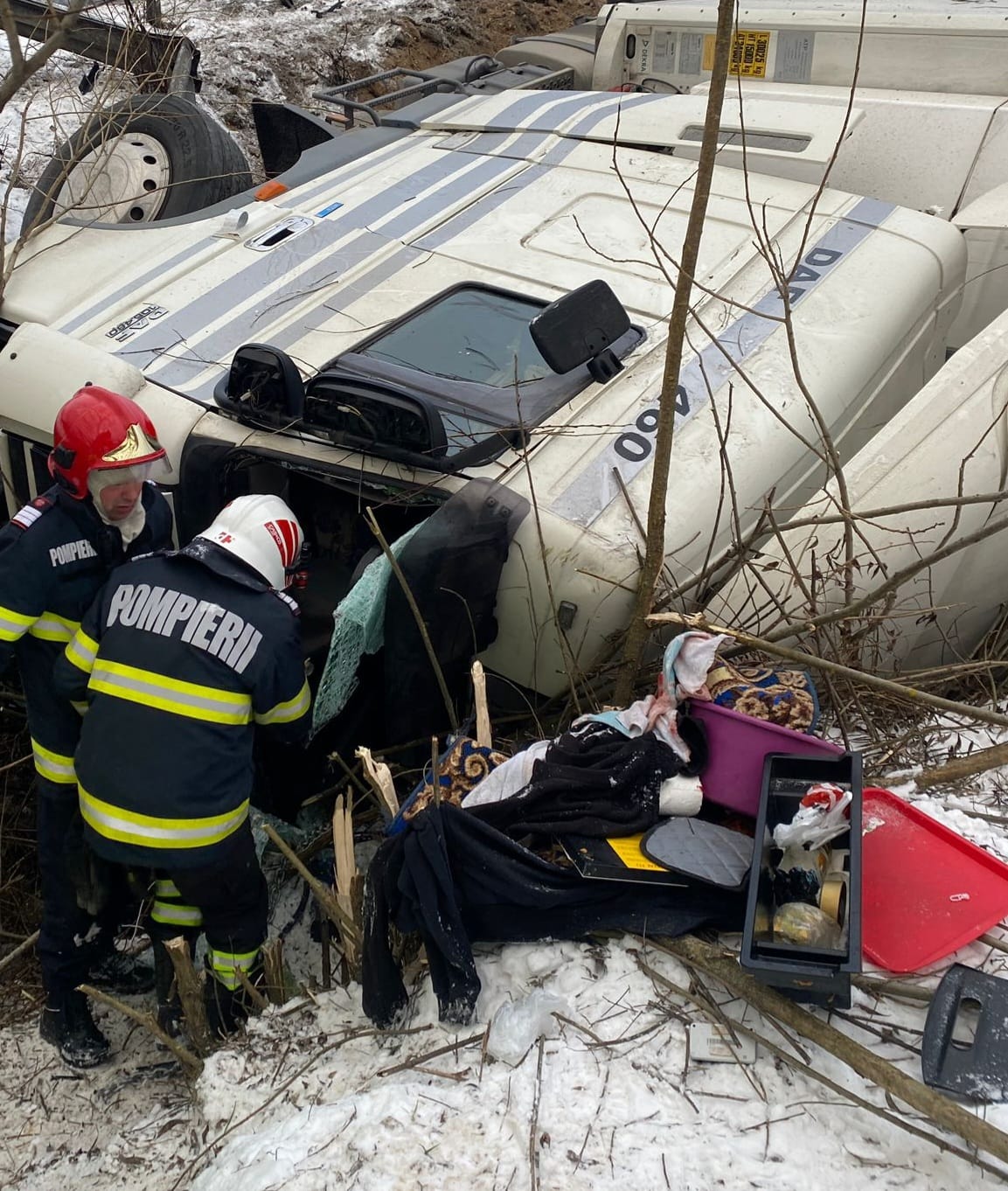 Autotrenul s-a rasturnat pe o parte, in albia unui parau, iar apa s-a adunat in cabina si exista pericolul ca soferul, prins in interior, sa intre in soc hipotermic.