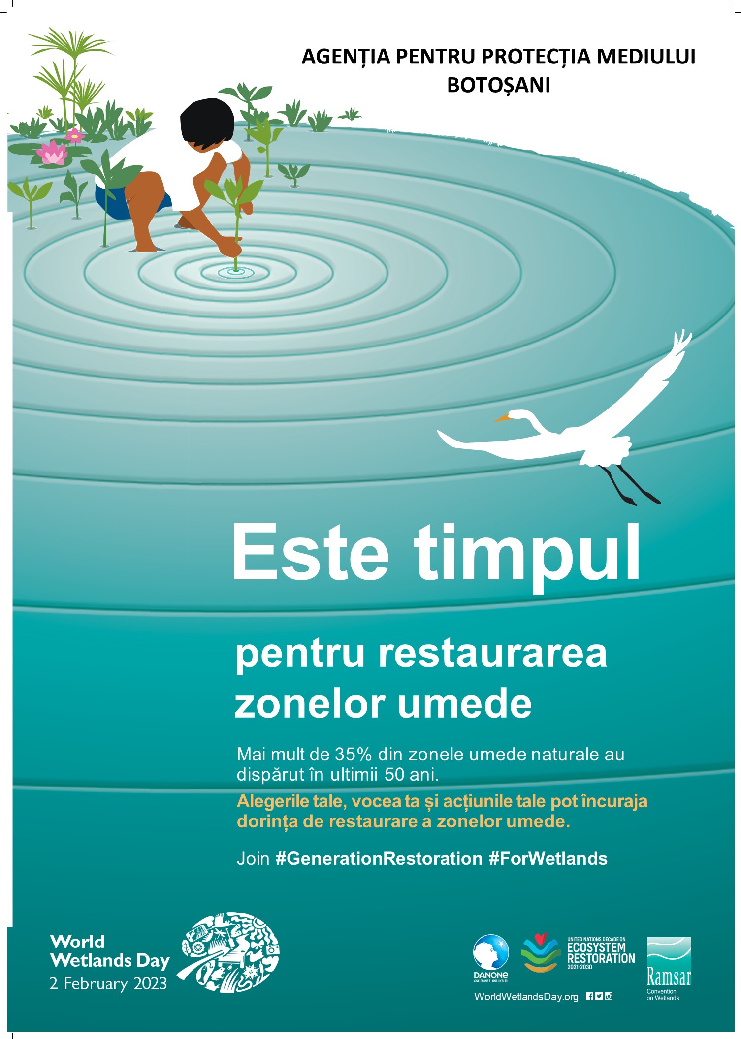 Agenţia pentru Protecţia Mediului Botoşani marchează Ziua Mondială a Zonelor Umede 2023 prin organizarea unor activități destinate sensibilizării și conștientizării opiniei publice cu privire la importanța conservării şi utilizării durabile a zonelor umede: realizarea și distribuirea de materiale informative, dezbaterea cu tema “Zonele umede – resurse naturale valoroase”, organizată în parteneriat cu Școala cu clasele I – VIII “Grigore Antipa” Botoşani, în ziua de 02.02.2023