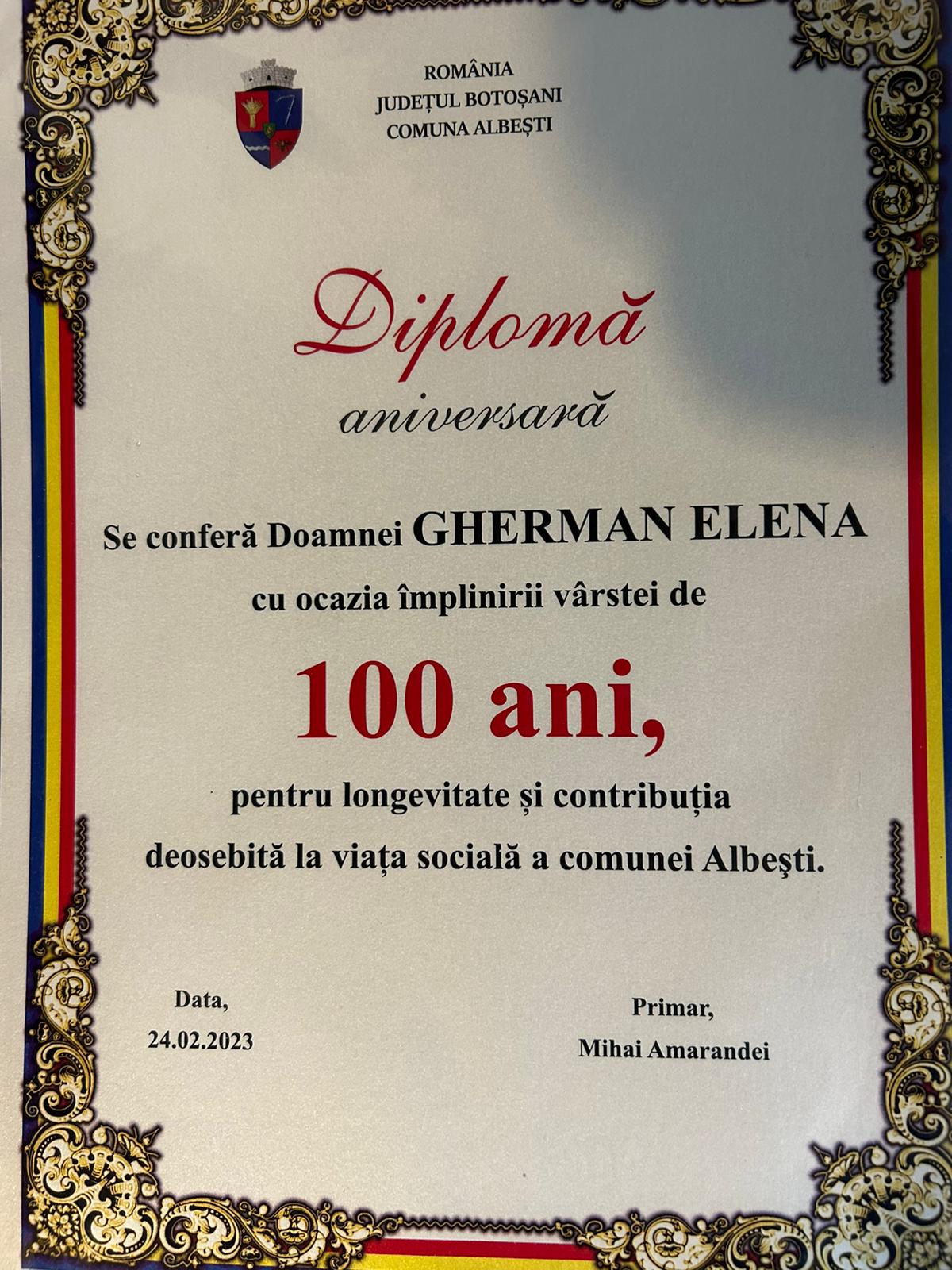 Tocmai de aceea conducerea Primăriei din localitate a mers să o felicite și i-a oferit flori, o diplomă aniversară, dar și o sumă de bani.