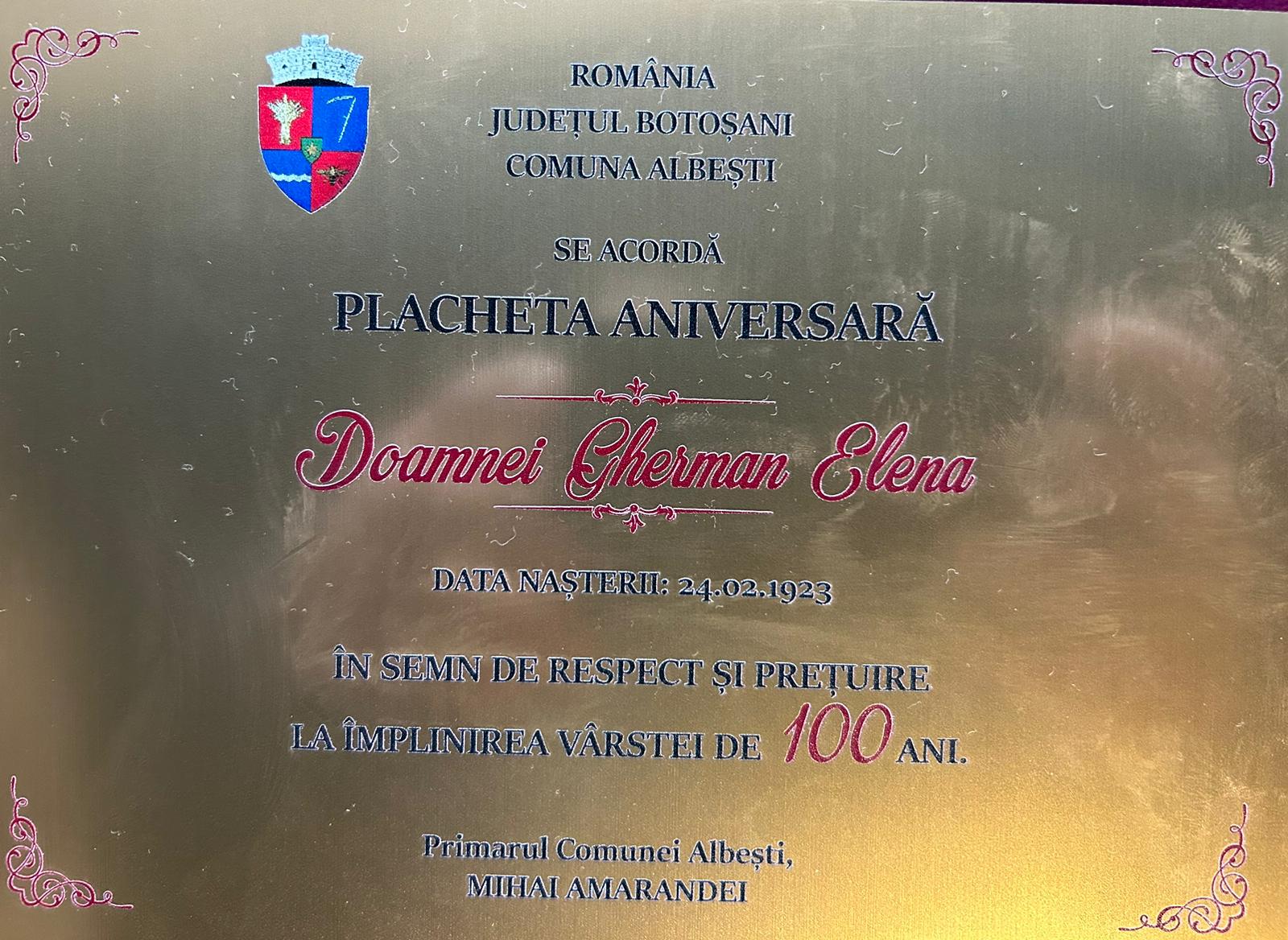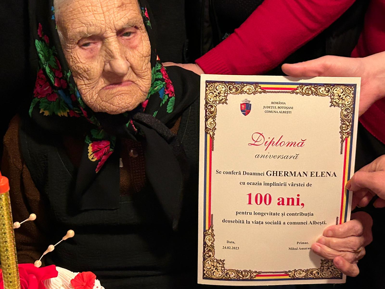 Încă o femeie din județul Botoșani a reușit să atingă venerabila vârstă de 100 de ani. Este vorba despre Elena Gherman, din comuna Albești, care pe 24 februarie a împlinit un veac de existentă.