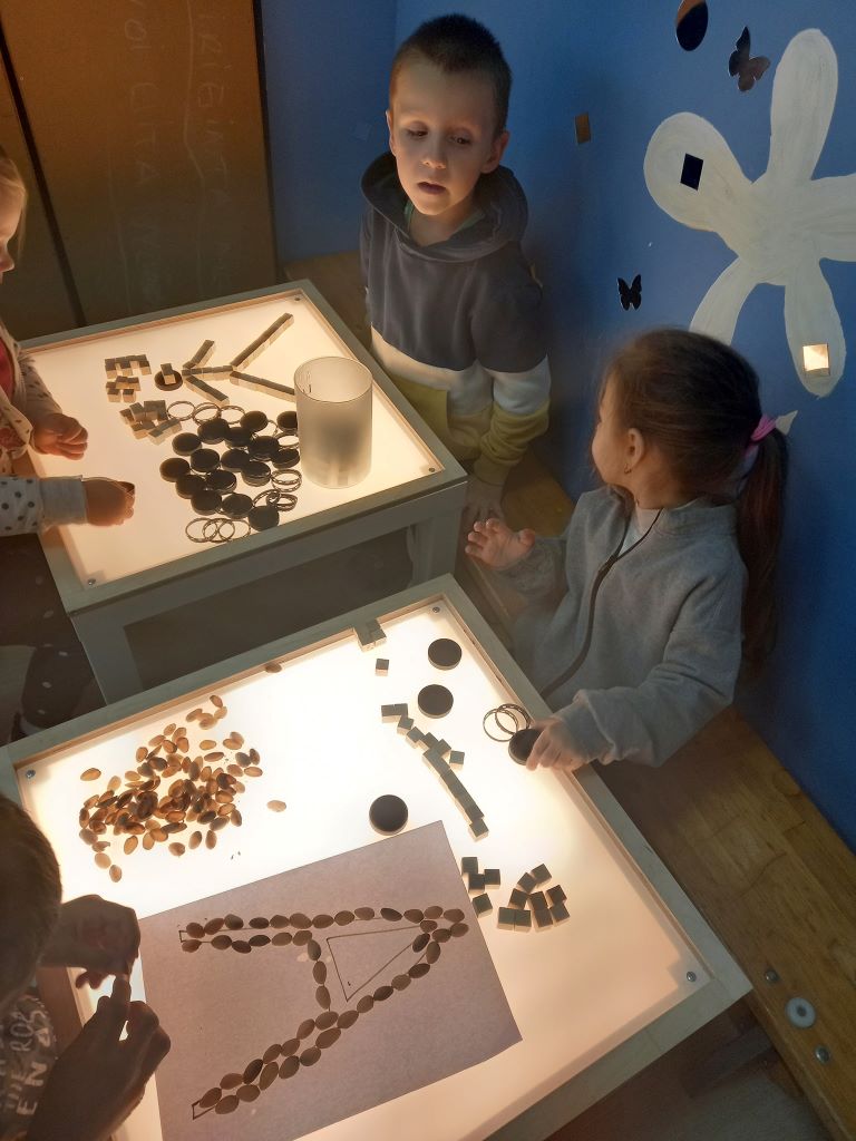 Sala de grupă în care învață cei mici este un loc în care pare să fi fost adusă natura, educatoarea folosind în activități foarte multe materiale de afară. De pildă, copiii desenează literele cu frunze, pietre sau scoici și își folosesc imaginația pentru a crea tot felul de desene pe podea.