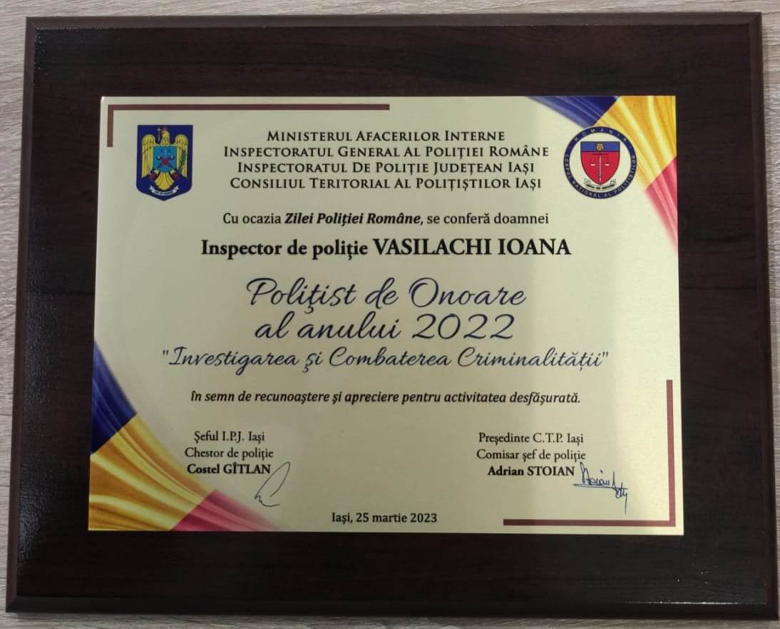 Ioana Vasilachi, originară din localitatea Mileanca, a fost premiat de Ziua Poliției Române, în semn de recunoaștere și apreciere pentru activitate desfășurată, la categoria „Investigarea și combaterea criminalității”.