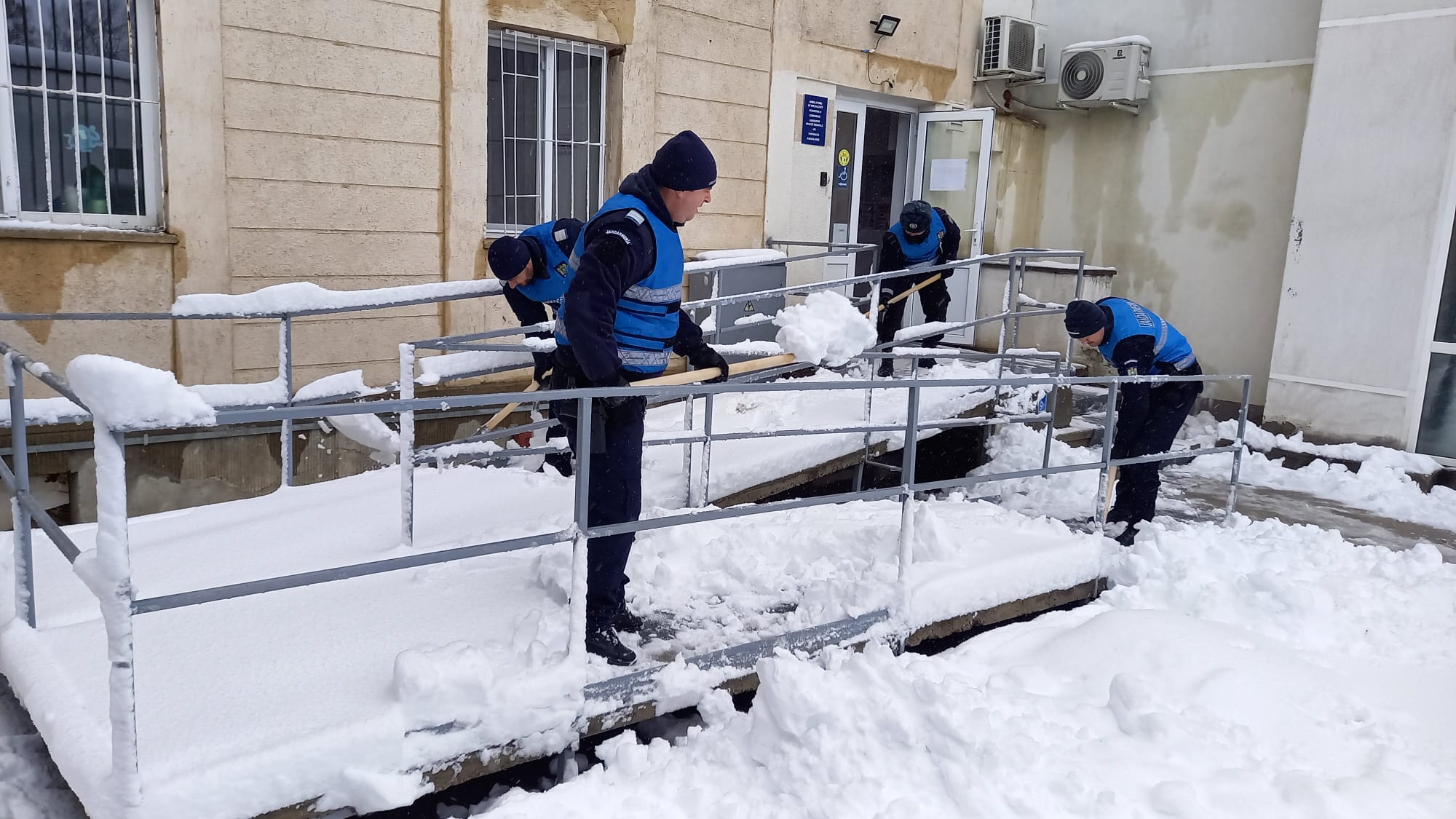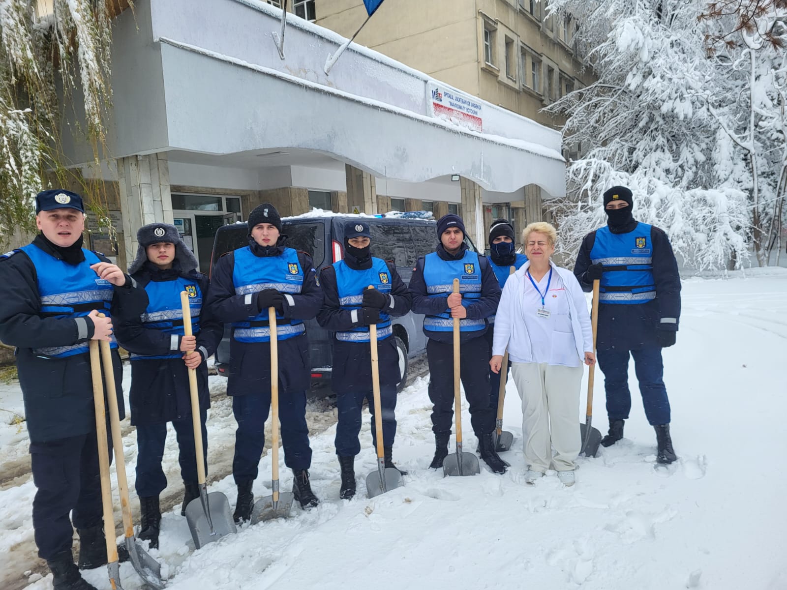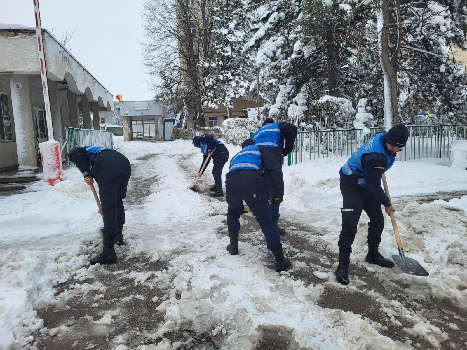 Mai multe echipaje de jandarmi ajută spitalele la degajarea zăpezii, pentru ca ambulanțele să poată intra cu pacienții.