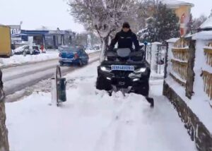 Jandarmii din Botoșani au ieșit să deszăpezească trotuarele din municipiul reședință de județ cu ATV-ul. În timp ce o parte dintre colegii lor luptă alături de militară, pompieri și polițiști pentru scoaterea oamenilor blocați cu mașinile în nămeți, alți jandarmi din Botoșani ajută la deszăpezirea curților spitalelor, dar și a trotuarelor din municipiu.
