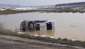 Accident cu pagube materiale, duminică, pe DN 29 D, pe raza județului Botoșani. O mașină în care se aflau două persoane. soț și soție, s-a răsturant în afara părții carosabile într-o baltă, după ce șoferul a pierdut controlul volanului. Evenimentul rutier a avut loc la intrarea în Șoldănești, mașina plonjând în apa provenită de la topirea zăpezii.