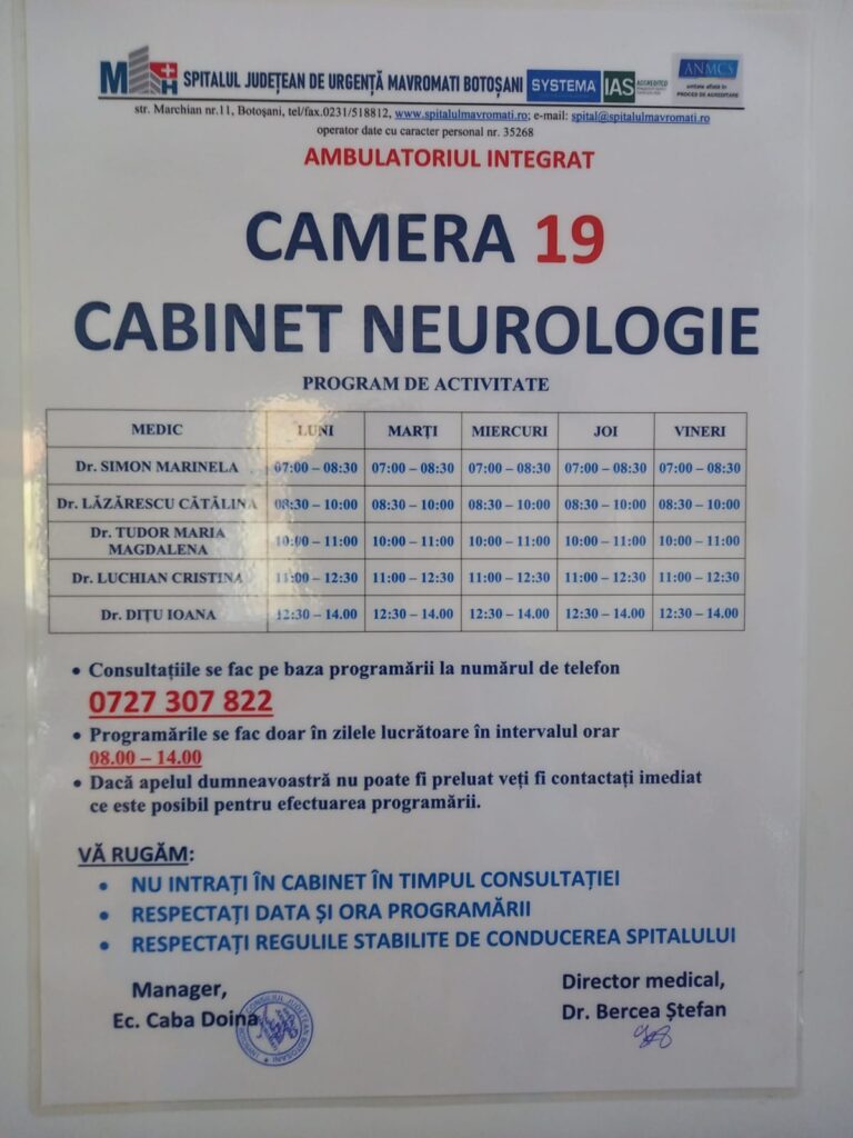 Programul de activitate al cabinetului de neurologie a fost modificat începând cu 02 05 2023, acesta fiind afișat atât la cabinet cât și pe site-ul spitalului. Pacienții se pot programa și online. Programările vor fi reluate după data de 15 05 2023.