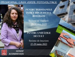 Alexandra Huțu: Botoșănenii pot să aplice pentru programul Casa Verde Fotovoltaice 2023 în perioada 29-31 mai, iar unitățile de cult în perioada 27-29 iunie