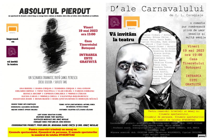 Universitatea Națională de Artă Teatrală și Cinematografică „I.L.Caragiale” (UNATC) din București împreună cu Teatrul „Mihai Eminescu” din Botoșani, vă invită, vineri, la teatru, cu intrare gratuită. Vă puteți astfel bucura de două spectacole de teatru pur românești. Este vorba despre spumoasa comedie „D`ale carnavalului” de Ion Luca Caragiale și spectacolul de dramă „Absolut Pierdut”, adaptare după Camil Petrescu și plecând de la piesele de teatru „Jocul ielelor” și „Suflete tari”.
