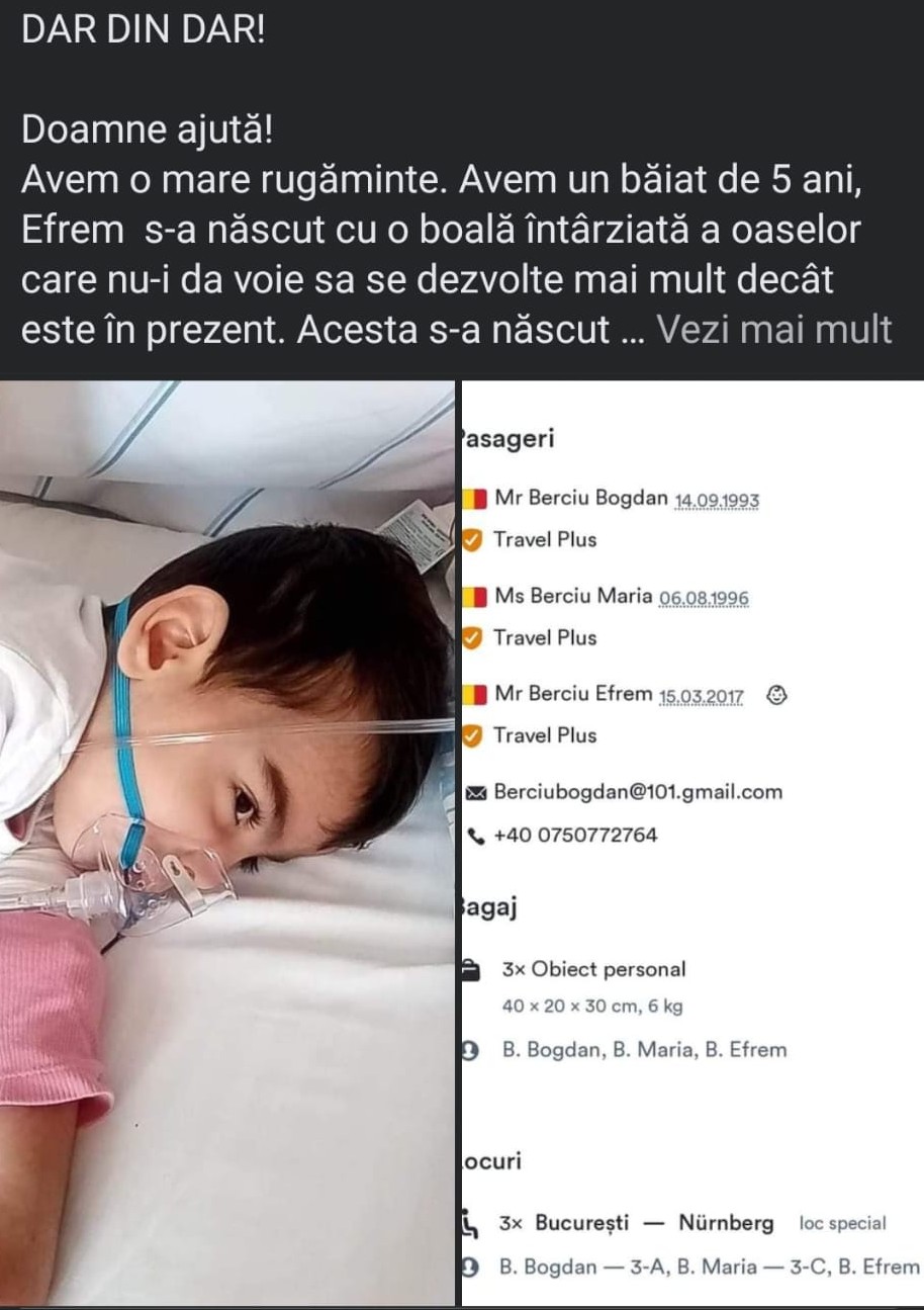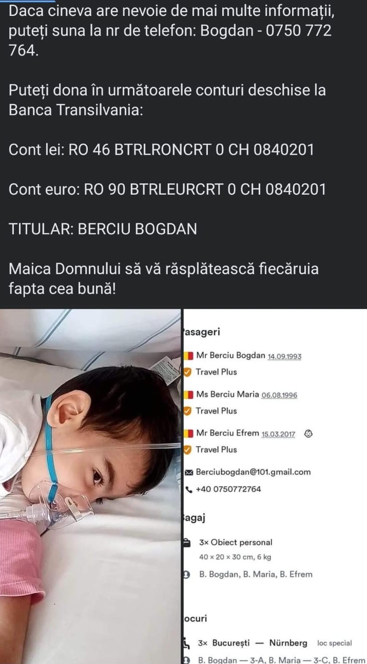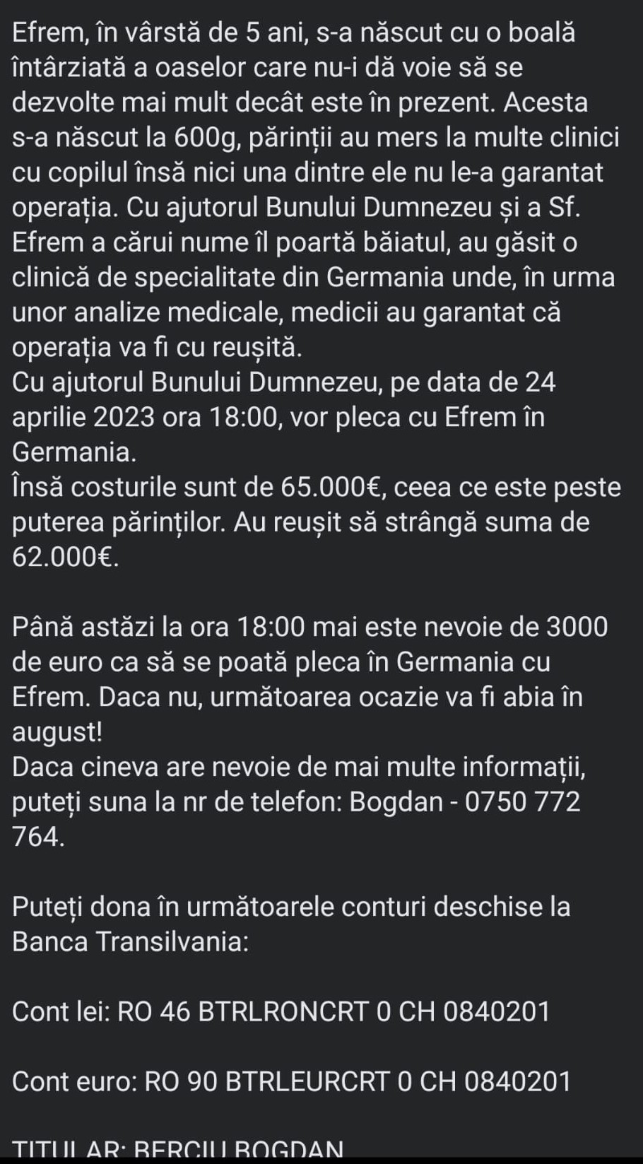 Astfel, a inventat povestea unui băiețel Berciu Efrem, de cinci ani, care „s-a născut cu o boală întârziată a oaselor care nu-i dă voie să se dezvolte mai mult decât este în prezent”. Pe motiv că ar avea nevoie de o operație în Germania, bărbatul apela la mila oamenilor și cerea 65.000 de euro. Așa zisul „Bogdan Berciu” lăsa un cont în lei și unul în euro, dar și un număr de telefon pentru credibilitate. Așa a reușit să strângă aproximativ 78.000 lei. Polițiștii botoșăneni i-au dejucat însă planul tânărului din județul Neamț.