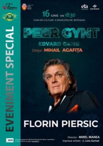 ”Pe tema celor 70 de ani de la înființare, Filarmonica George Enescu Botoșani pregătește un eveniment special! Pe 16 iunie 2023, de la ora 18:30, la Casa de Cultură a Sindicatelor va fi prezentată opera „Peer Gynt”, pe compoziția pianistului norvegian Edvard Grieg, sub bagheta dirijorului Mihail Agafița, în interpretarea inegalabilului Florin Piersic! Organizatorii promit un spectacol „de zile mari””, spune Cosmin Andrei.