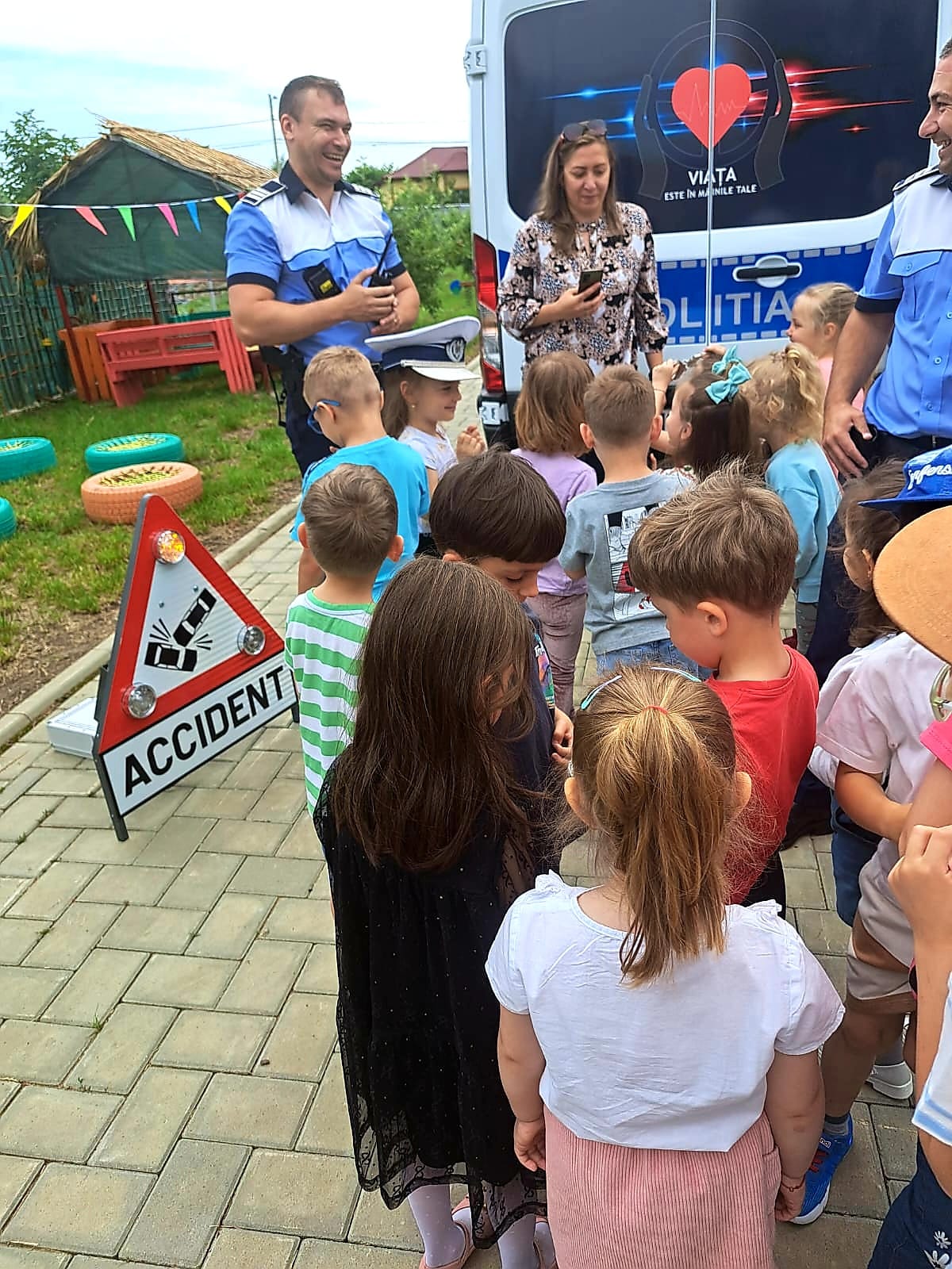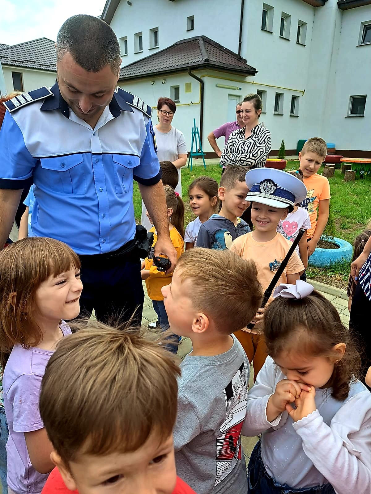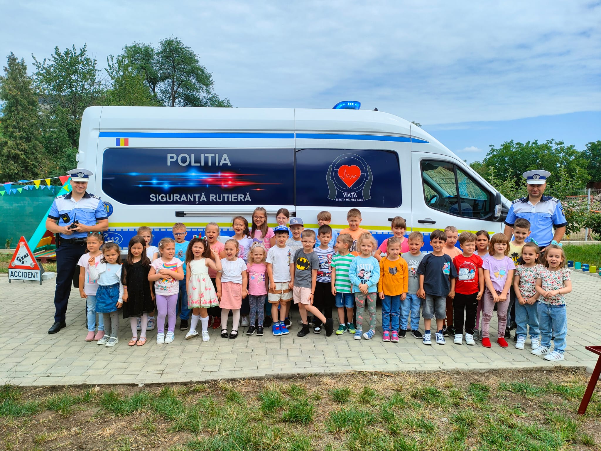 Polițiștii din cadrul Poliției Municipiului Dorohoi- Biroul Rutier i-au vizitat, pe 19 iunie, pe copiii prezenți în grădinița cu program prelungit "Albă ca Zăpadă", din municipiul Dorohoi.