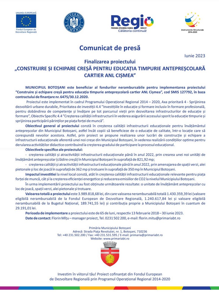 Date de contact: Florin Mîțu – manager proiect, Tel. 0231 502 200, e-mail: florin.mitu@primariabt.ro