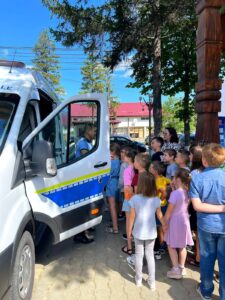 În același context, copiii au primit vizita polițiștilor rutieri care le-au prezentat principalele reguli de comportament în trafic. Polițiștii au discutat despre traversarea în siguranță, care sunt regulile de circulație atunci când sunt pe biciclete, unde este locul lor în automobil, precum și alte noțiuni de educație rutieră necesare acestei categorii de vârstă.