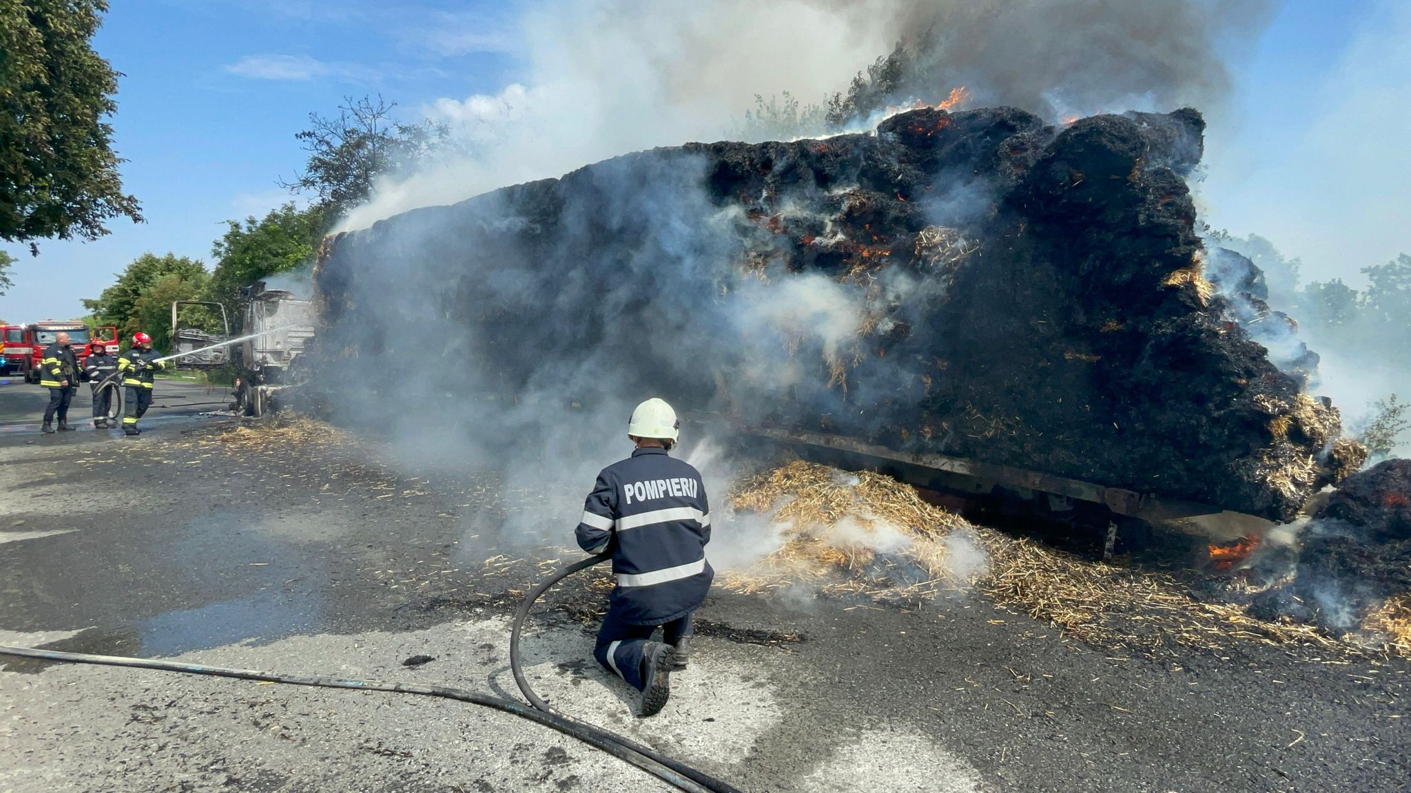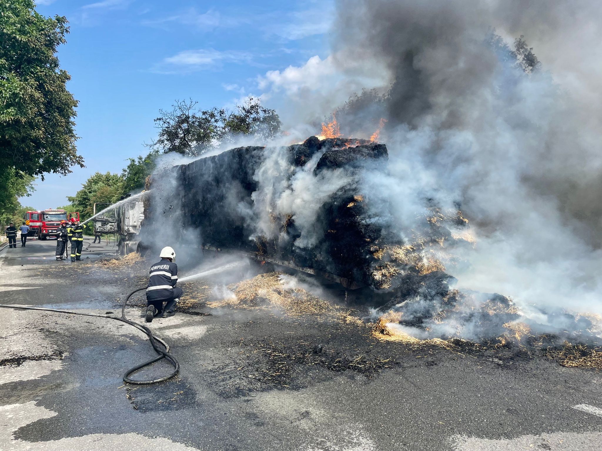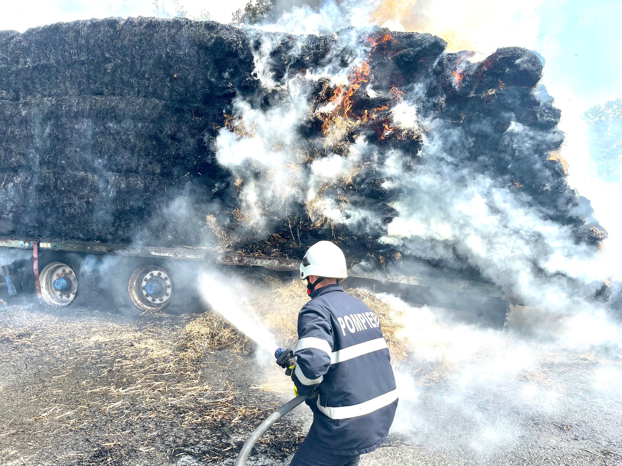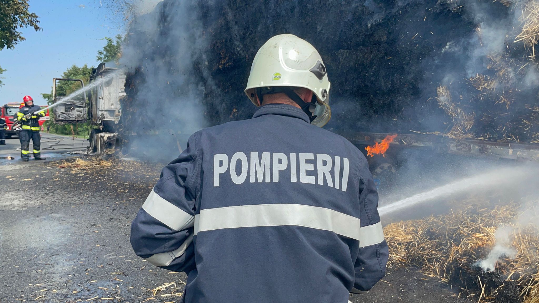 Un camion a luat foc pe un drum din Botoșani. Pompierii botoșăneni au intervenit, miercuri, pentru a stinge un incendiu ce a cuprins un camion încărcat cu baloți de paie.