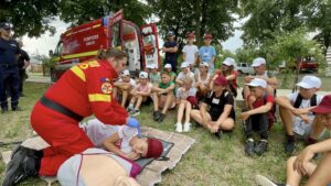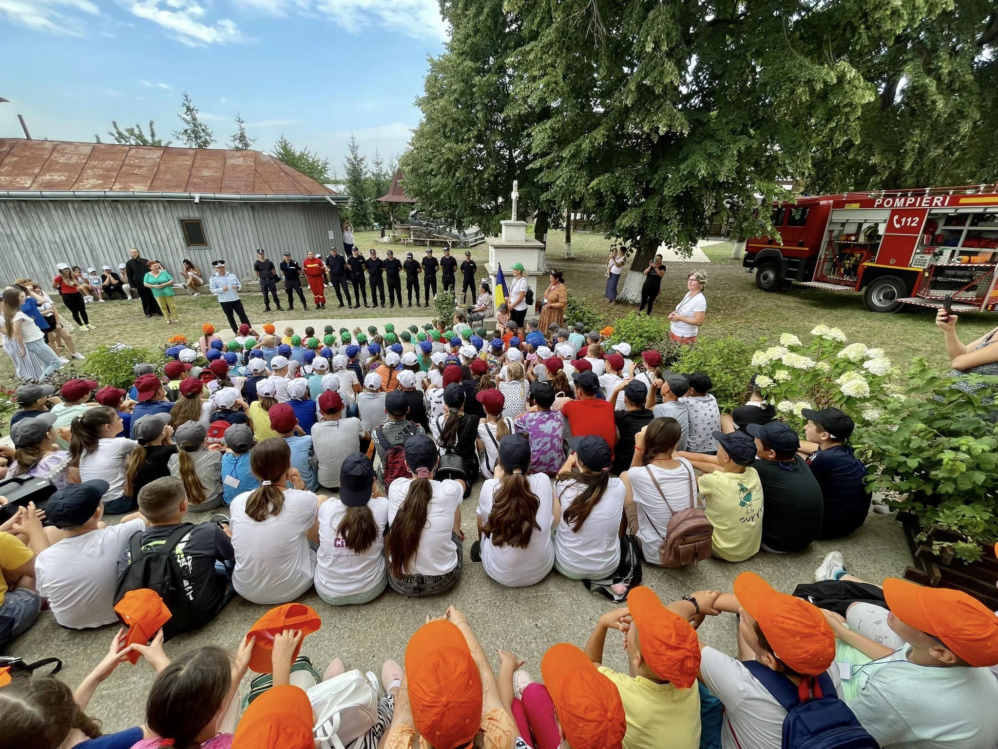 Pompierii botoșăneni s-au alăturat astăzi celor 200 de copii din cadrul taberei „Vara pe uliță” organizată de Parohia Doina, Răuseni.