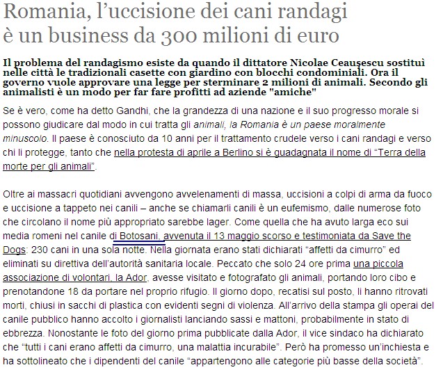 Citindu-l pe Ghandi, care spune ca grandoarea unei natiuni si progresul ei moral se masoara in felul in care trateaza animalele, publicatia scrie ca Romania este o tara minuscula moral („la Romania è un paese moralmente minuscolo”). Tara e cunoscuta pentru tratamentul crud impotriva ciinilor, mai arata textul: „Problema ciinilor vagabonzi a existat de pe vremea dictatorului Nicolae Ceausescu”. Guvernul vrea sa adopte o lege prin care se extermina 2 milioane de animale, metoda de a face profit companiile prietene. Articolul aminteste de incidentul de la Botosani, cind au fost omoriti 230 de ciini intr-o noapte si de protestele organizatiilor care militeaza pentru drepturile animalelor, atit in Romania, cit si in afara granitelor, cum a fost protestul de la Berlin.