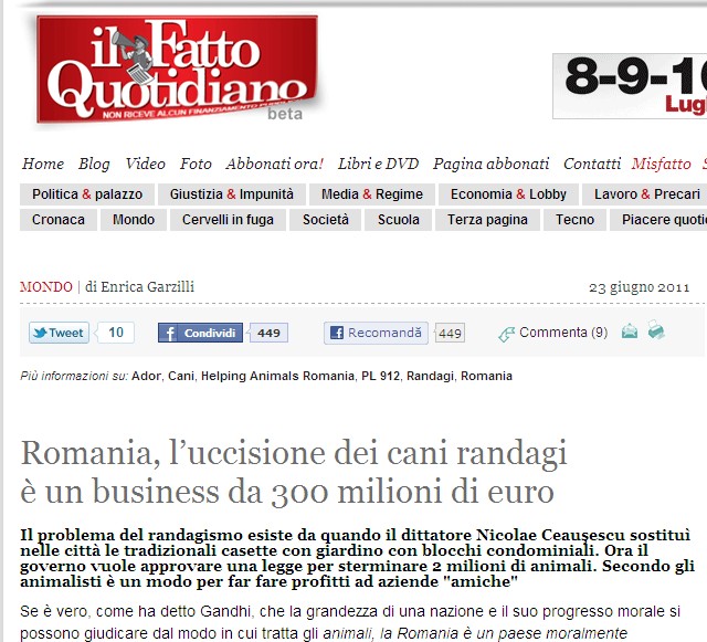 Ziarul Ilfattoquotidiano din Italia a publicat, în această săptămână, un articol eferitor la situatia ciinilor din Romania. Cu titlul „Uciderea ciinilor mandanezi, o afacere de 300 de milioane de euro”, materialul ataca dur tara noastra.