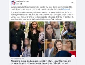 O organizație neguvernamentală din Cluj a anunțat demararea unei colecte publice de fonduri pentru copiii din Botoșani ai căror părinți au murit, la sfârșitul săptămânii trecute, în urma unor evenimente cumplite. Asociația Stergem Lacrimi vrea să ajute financiar cei trei copii ai Alexandrei, tânăra de 25 de ani care a murit în spital, din cauza nepăsării cadrelor medicale, dar și pe cei doi copii ai lui Cosmin Marius, angajatul Penitenciarului Botoșani care s-a înecat în mare în încercarea de a salva un băiețel de șase ani.