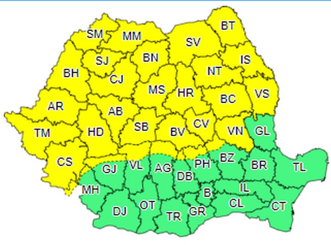 „Vor fi averse și cu caracter torențial, descărcări electrice, intensificări ale vântului (în general cu rafale de 55…70 km/h), pe arii restrânse vijelii și grindină în Maramureș, Crișana, Banat, Transilvania, cea mai mare parte a Moldovei, precum și în nordul Olteniei și al Munteniei. În intervale scurte de timp sau prin acumulare cantitățile de apă vor fi de 20…25 l/mp și izolat peste 40 l/mp”, au informat, duminică, meteorologii.