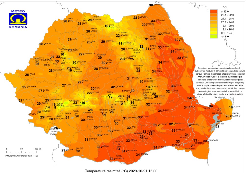 În mai multe localități din țară temperatura resimțită în această zi de toamnă a fost de 34 grade Celsius.