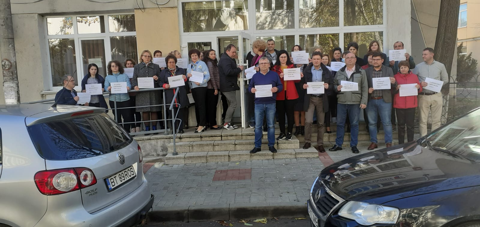 Zeci de salariați ai Casei Județene de Asigurări de Sănătate Botoșani au protestat, astăzi, 6 noiembrie, în fața instituției, nemulțumiți de salariile pe care le primesc. Dacă în primele două zile protestul a avut loc în birouri, astăzi salariații au protestat în fața și pe holurile instituției, purtând pancarte.