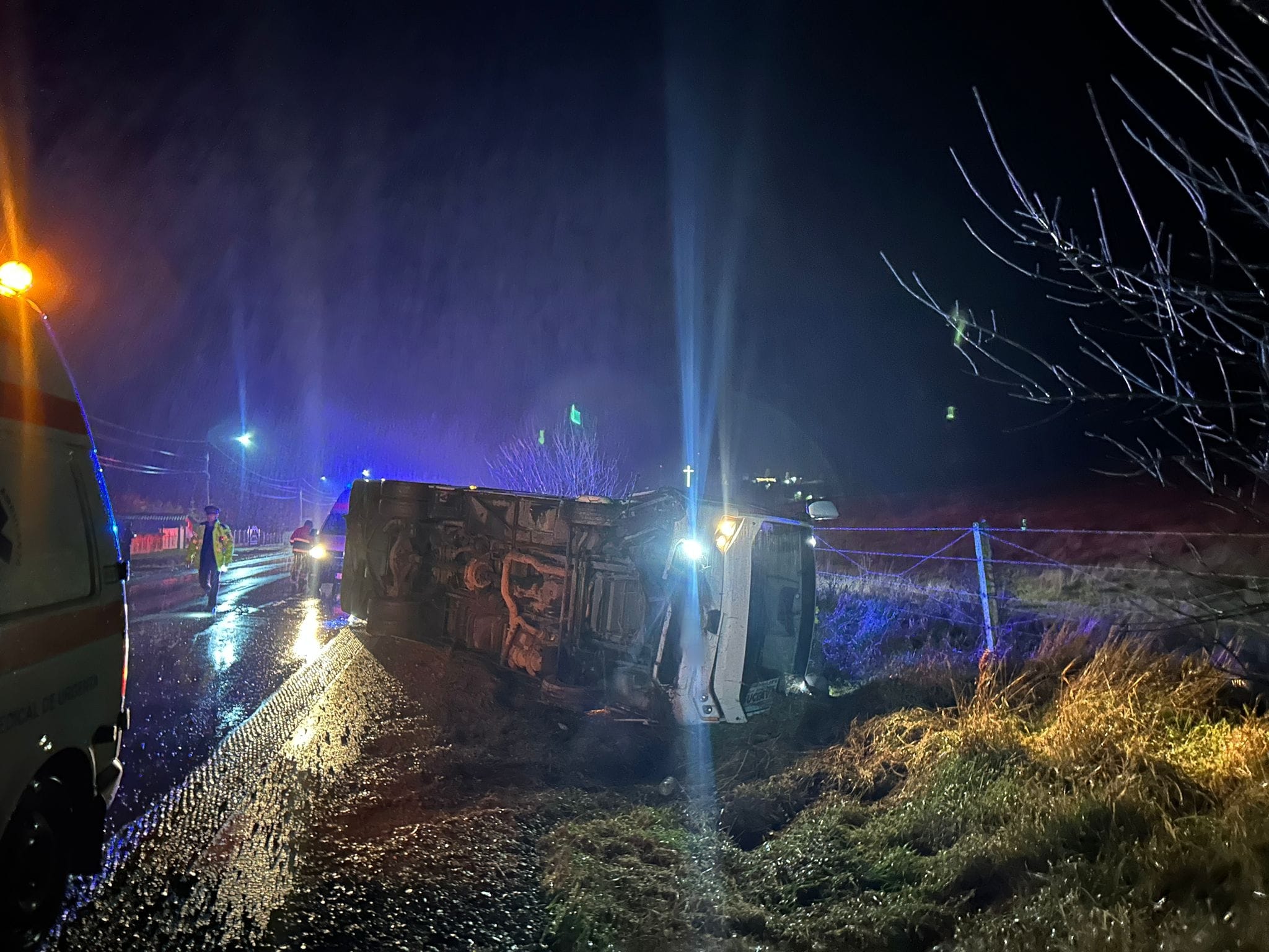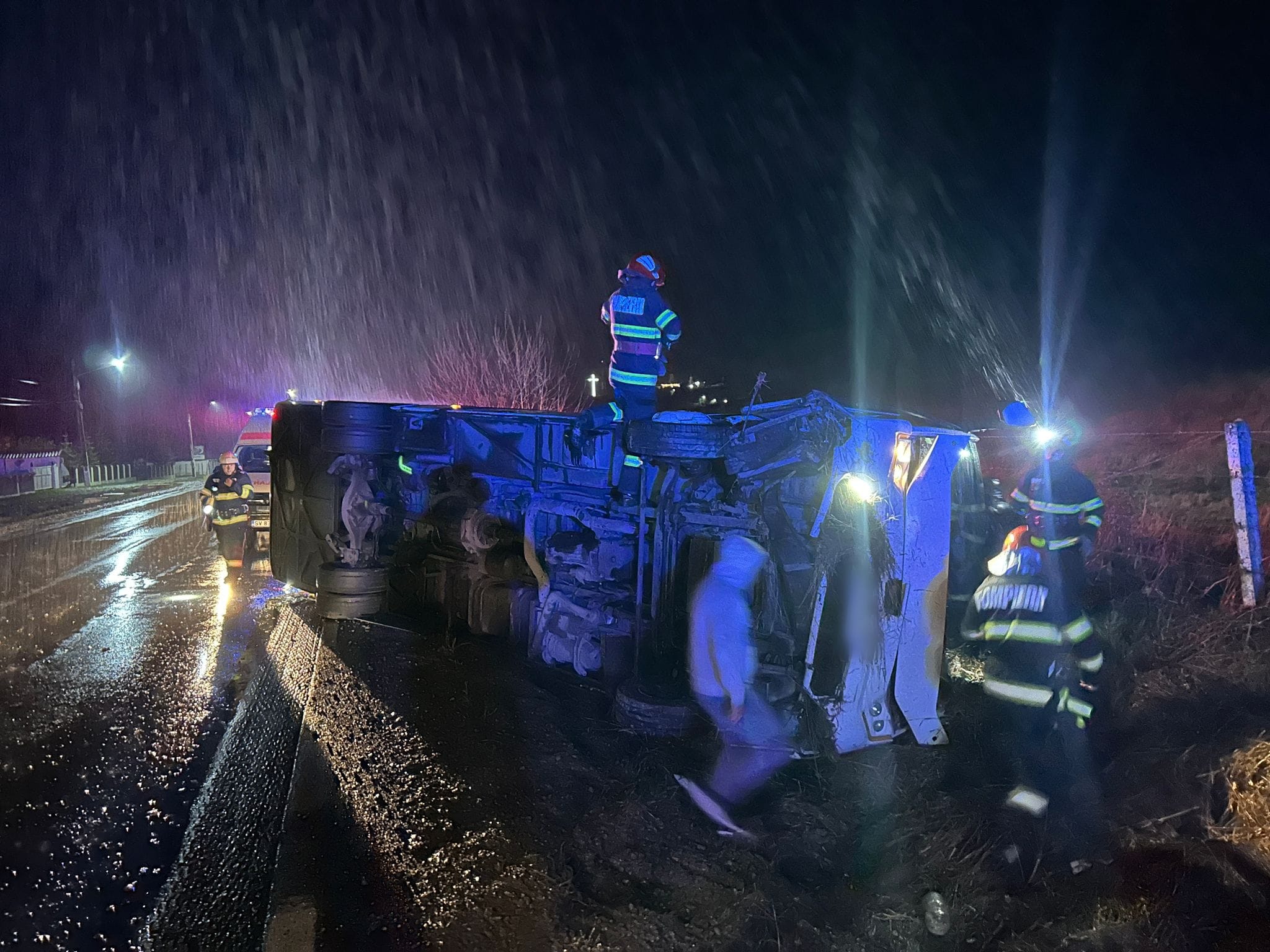 Un accident cu șapte persoane implicate, dintre care doi minori, a avut loc în noaptea de miercuri spre joi, în județul Suceava. Un miniautocar s-a rasturnat in afara partii carosabile, pe drumul E85, pe raza localitatii Roșiori, comuna Forăști, potrivit reprezentanților Inspectoratului Județean pentru Situații de Urgență Suceava.
